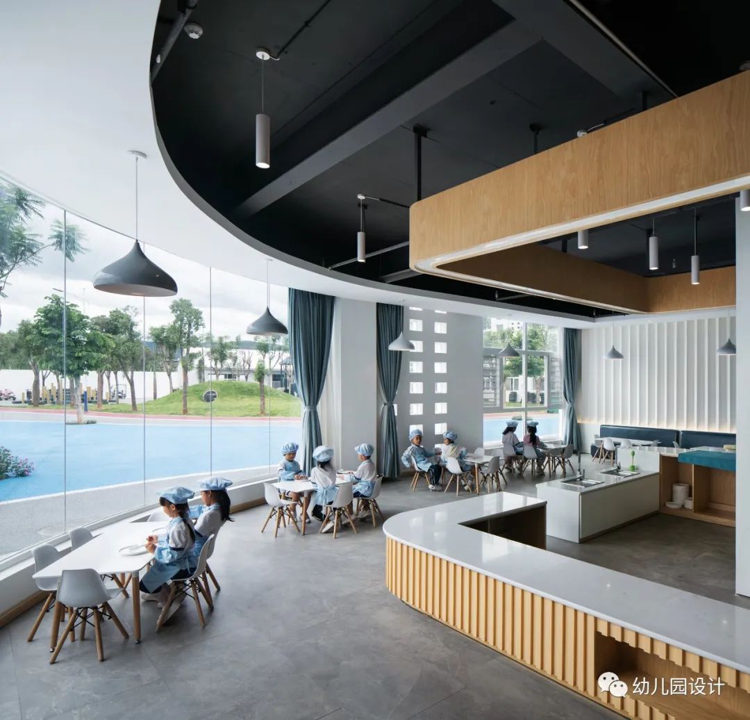 儿童餐厅就餐的大厅形成半围绕的结构,空间疏密相互呼应且与周围景观融为一体,专业设计和定制的儿童厨房开放且易于孩子使用 ,儿童尺度的桌椅对于孩子而言合适而又充满安全感,同时配备有充足的储物空间,大面积的玻璃窗无缝融合了窗外的景色,白色与灰色的空间基调,有一种天空中的梦幻,阳光透过玻璃窗在地面上留下阴影,而孩子们可以安静的欣赏周围的自然景观,与外界产生交流。