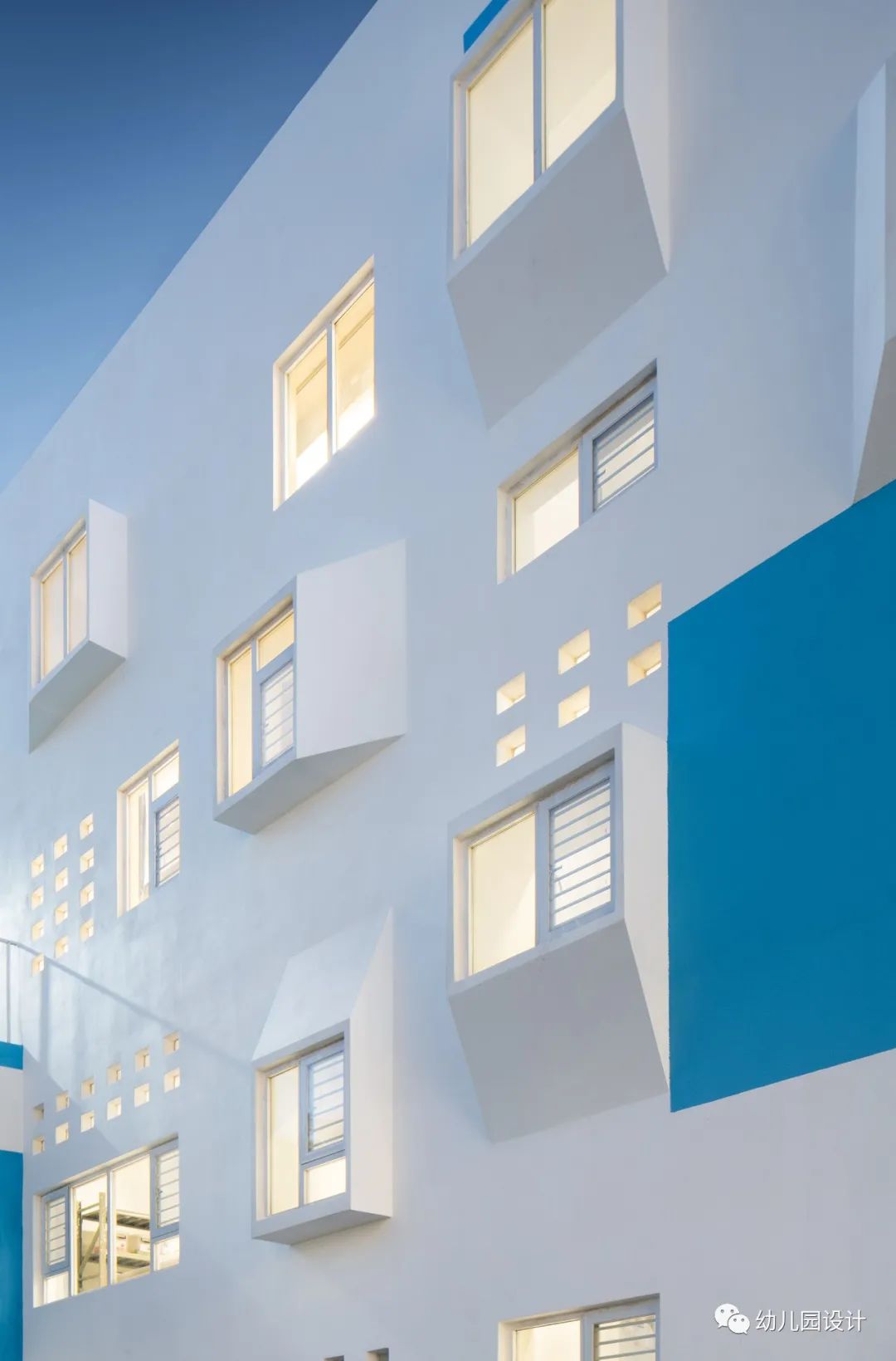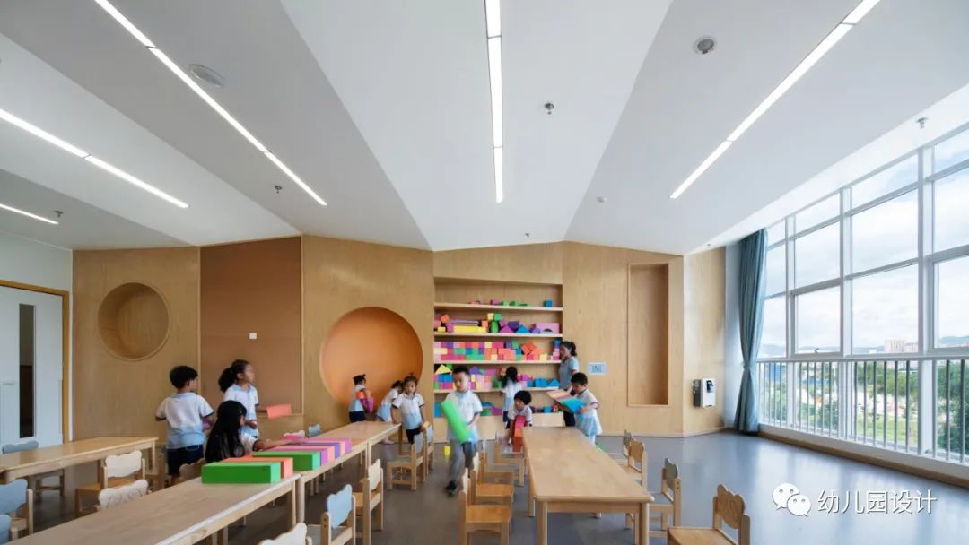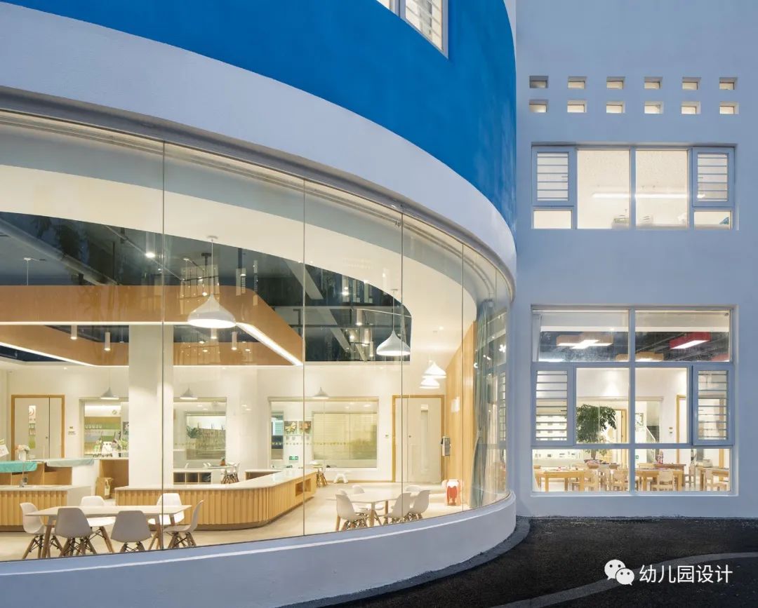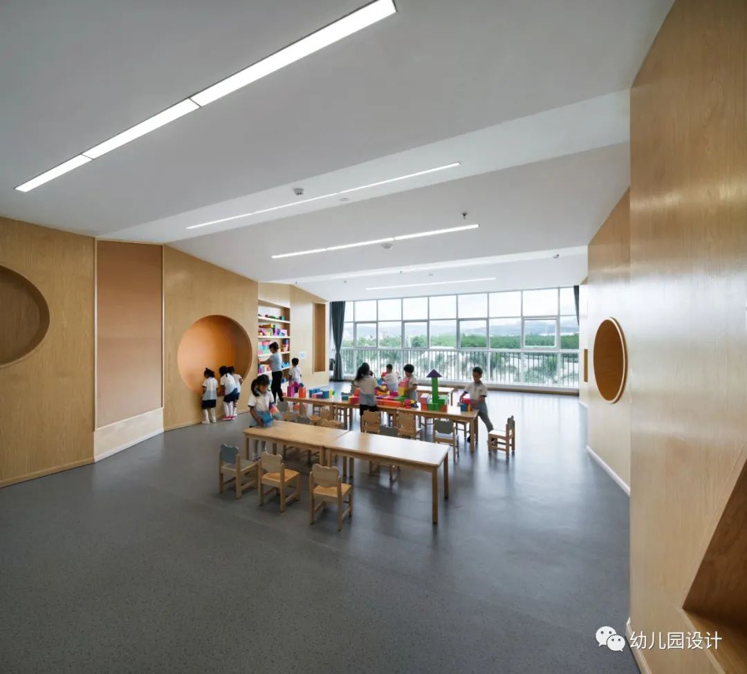 建筑本身就像是互相了解的一个窗口,立面上面积最大,最为显眼的开窗均设置在南侧,为幼儿园室内提供了良好的自然采光,充分的尊重了建筑周边的自然环境,设计师通过很纯粹的手法,将室内外的空间很自然的衔接起来,当窗户完全打开,阳光的倾洒是孩子们和老师侃侃而谈时最美的点缀。