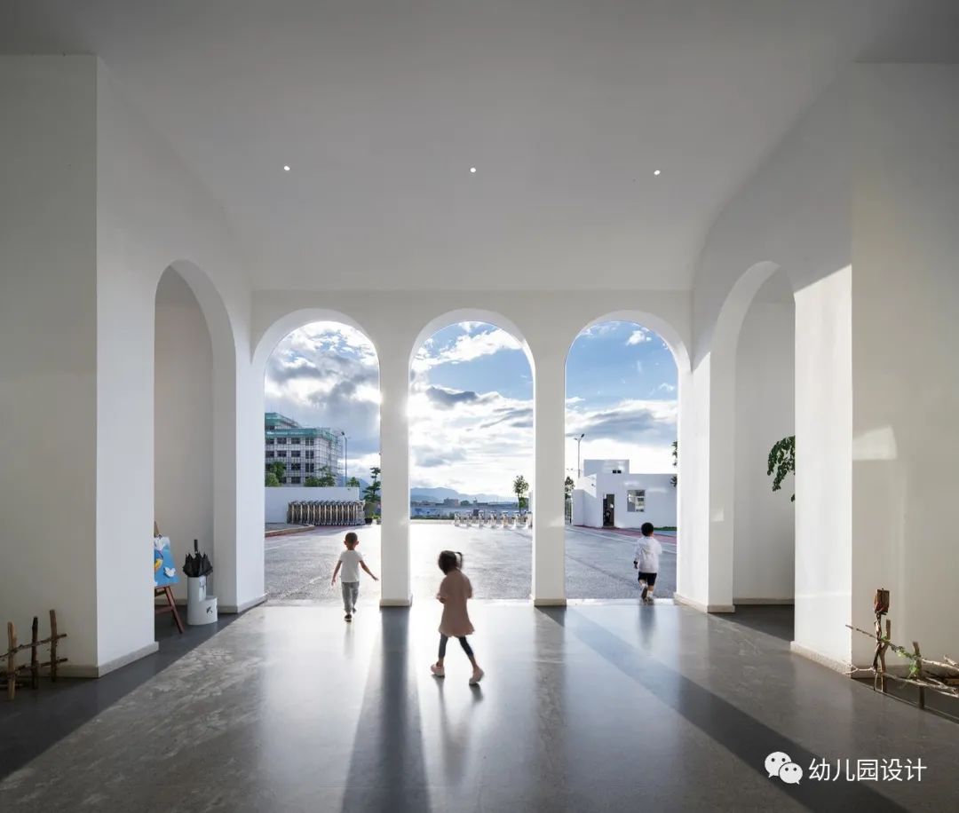 我们喜欢在幼儿园设计中采用自然光线的引入,它本身节约能源消耗,同时又为孩子们带来更多的舒适度,并能最大程度将自然采光引入建筑之内,阳光透过廊道,在地面上形成阴影,内外交融。