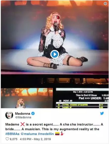 在Billboard音乐颁奖礼上,麦当娜和拉丁裔歌手Maluma合作表演了歌曲《Medellín》,现场融入了各种AR元素,比如环境、流行歌星的舞蹈克隆。本次使用了AR增强现实技术,麦当娜在现场扮演“神秘的X夫人”这一角色,与各种AR人物一起同台跳舞,包括秘密特工,cha-cha讲师,新娘和音乐家。