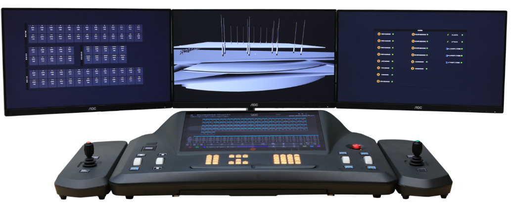 使用多屏组合,除了自带15寸高清触摸屏,还可外接4个高清触摸屏。采用了模块化可扩展设计,手柄操控模块可扩展,6个操纵杆能同步运行6个场景。配备了独立抽拉式键盘,操作更为简便、专业。且还设置了独立急停按钮,每个操纵杆配两个液晶显示按钮,获取运行状态更方便。