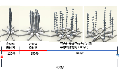 动态雕塑机械装置设备分别由8套结构相似的开合立柱和平移机构组成,平移机构均匀的呈圆周整列式分布,可沿着运行轨道向着远离或汇聚圆心的方向运动,平移机构在移动的同时进行旋转,带动开合立柱同步运动,开合立柱从分散状态到合拢成人形需要450s。其中,开合立柱旋转平移的时间为180s,叶片变换时间为150s,运行到安全距离的时间为120s。