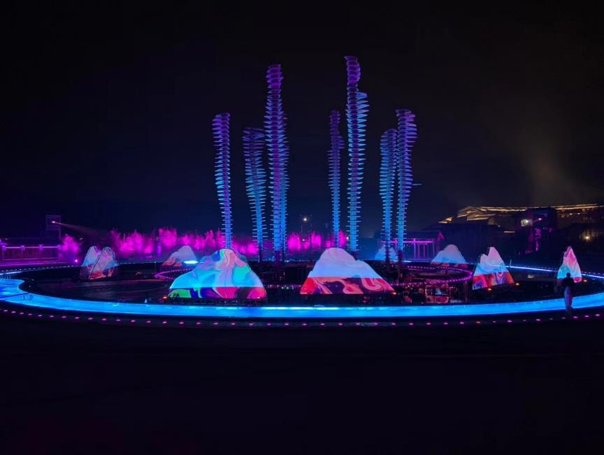 室外水舞台表演区配置有11台水中升降砚台,1台水中翻板台,水中通道钢结构等。