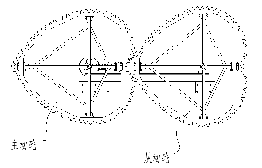 党徽为镰刀和锤头组成的图案,是中国共产党的象征和标志,其外形尺寸达16m×16m×1.5m,重达14T,作为本次文艺演出最为重要的设备,当他从主屏幕后缓缓升起时,以其极具凝聚力的震撼画面突出整个演出的主题。党徽隐藏在舞台中间LED大屏后方钢结构内,通过驱动、传动、导向、配重系统的相互配合,在需要的剧目中冉冉升起,升起后距地面最高可达54.5m,升降的速度为0.003 m/s-0.300m/s,升降行程为19m,为提高其运行的可靠性,驱动系统采用卷扬机+过配重闭环反拉机构,驱动电机采用1主1备双电机冗余,正常情况下,主电机驱动运行,主电机故障时切换到备用电机驱动,最坏情况下(主、备电机均出现故障或电气系统故障时),手动释放制动器,可确保设备实现党徽的顺利升起。
