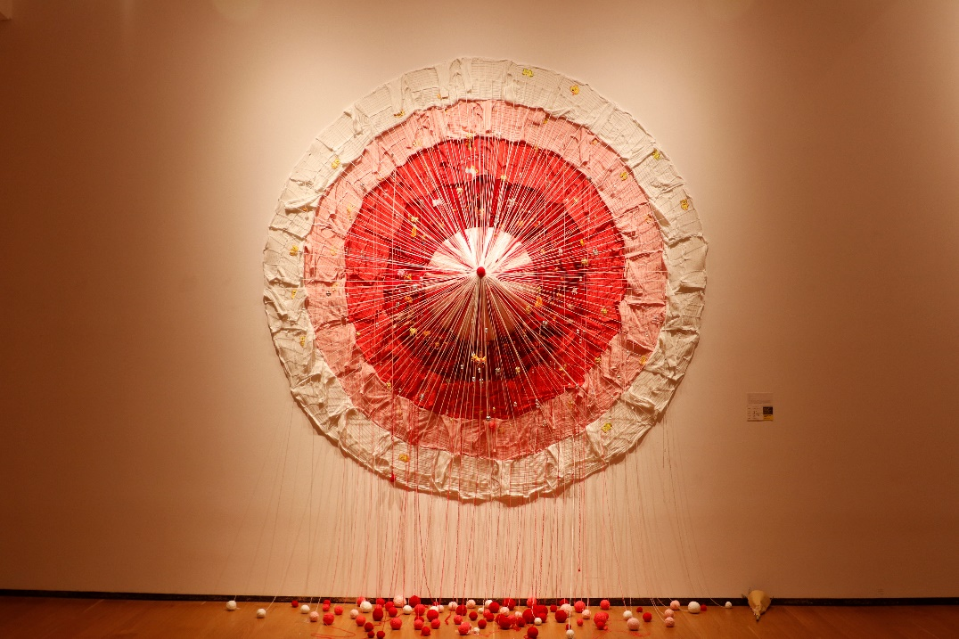《满月•忆》,装置艺术,毛衣、毛线、长命锁,2.5m*2.5m,2021年