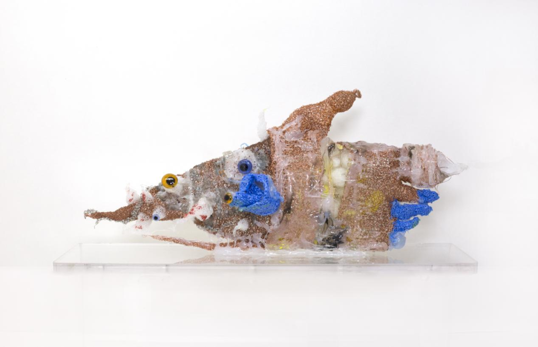 海洋环境污染问题严峻,海洋“居民”的痛苦喘息和科技发达享受美好生活的我们对比强烈,不难想到灾祸降临在人类身上的那一天;铜丝这种金属材质,在具有科技工业感的同时又透露着冰冷感,加入人体的一些元素在现有冰冷感的基础上营造海洋生物变异的氛围,单个造型上添加的玻璃人偶眼珠让它们更加像生命体,同时也像是自未来的凝视和审判。