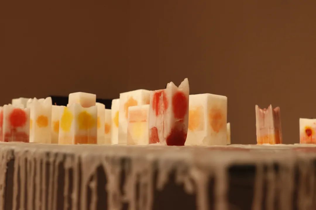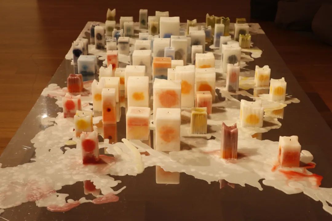 重庆的天气无论是春夏秋冬永远都是围绕着“雾"而展开的,“雾”的意象给人一种模糊不清模棱两可的情绪。从艺术疗愈和色彩心理学的角度出发,作者希望运用对“雾”的颜色和感官体验的独特性来塑造出香薰蜡烛的形态。在动手制作过程中作者将雾的意象与香薰蜡烛相结合,不同的天气对应着蜡烛不同的颜色和气味,借助每个雾气天气带来的不同视觉和嗅觉体验,展现出雾意象独有的静谧与沉稳感,区别于传统定义上的追求的日落型光热温暖治愈。装置由不同尺寸的蜡烛组成,镜面玻璃的镜像效果反映出高低错落的蜡烛,同时也隐喻重庆鳞次栉比的建筑,蜡烛上的图形对应着重庆不同雾气中的天气,以及不同雾气中的天气,以及天气带给人们的视嗅觉体验,宁静唯美的意向表达了“雾"这个意向对人们独特的治愈性,并减少冬日或者忧郁心情带来的综合焦虑症。