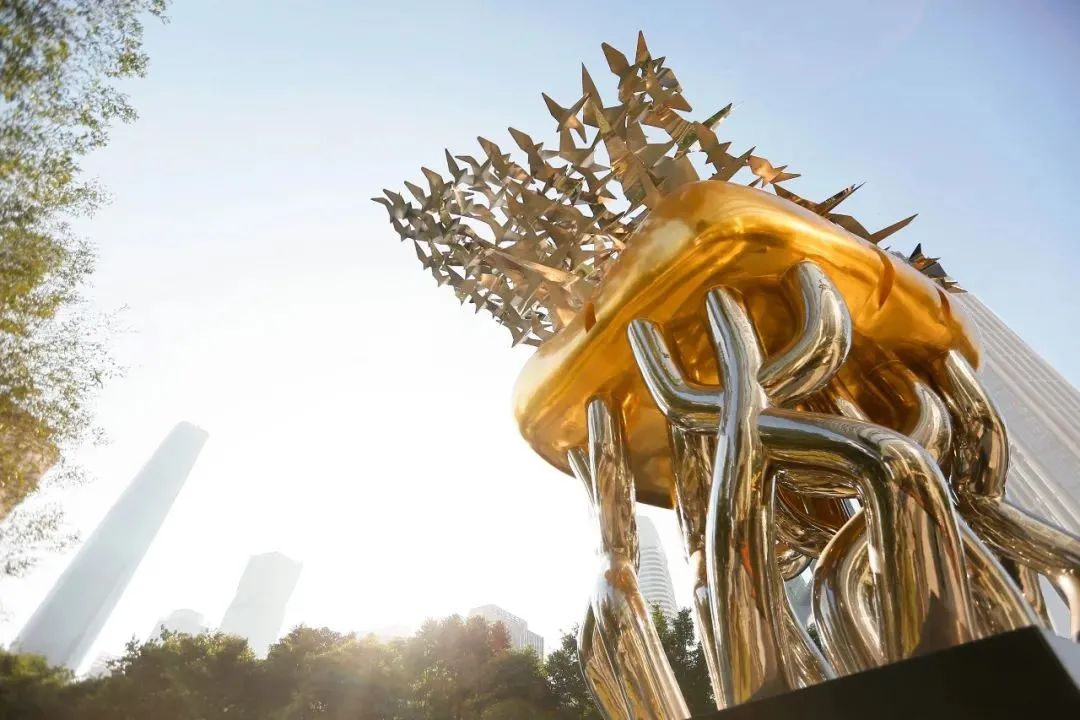 位于广州IFC的这件作品整体模拟了人体肌肉交叉连贯的线条,将“力”的健美展露无遗。而“金蝉”“饮露而不食”,寓意品德高尚、守时守信,符合广州IFC的定位;孩童捕蝉则彰显天真、积极、勇敢的精神。