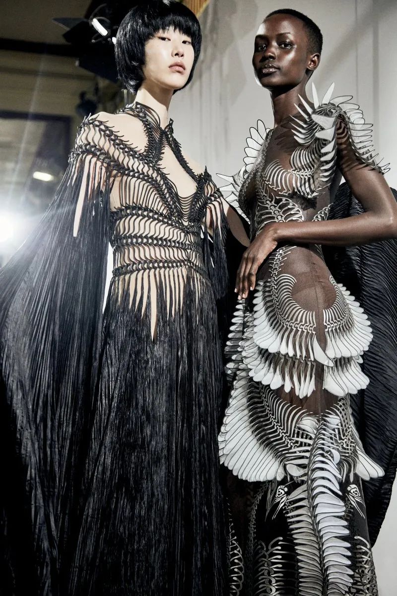 从尘埃、蒸汽和微生物中汲取灵感,将丝绸重叠堆砌,利用激光对面料进行精妙的切割,还有经典的 3D 打印花边......她的设计大量采用高科技元素,并将古老手工艺与之结合,创造性地实现了两个世界的完美融合。