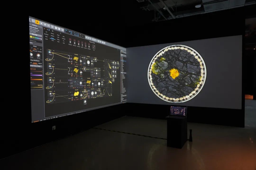 孙方正的作品《修格斯末裔的低语》,每30秒拍摄⼀张黏菌生长的照片,拍摄26小时并合成3分钟的影像。然后通过 Max/MSP/Jitter 实时拾取并处理黏菌生长的影像,然后通过 Jitter 和 openCV 视觉分析库将其轨迹的坐标数据、运动数据分轨输出 Midi 信号到 Bitwig 的 the grid 模块环境,从而将 Midi 信号转换为控制声音合成参数的波形数据,最终生成声音。