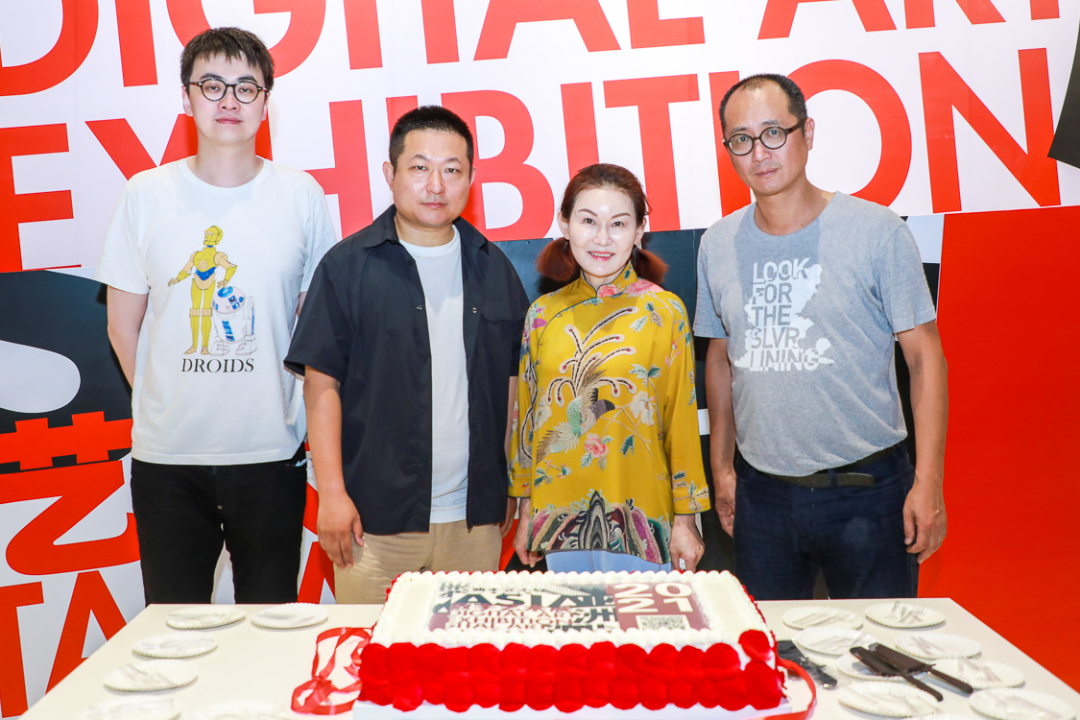 ▲ “2021亚洲数字艺术展”策展人邱志杰(右一)、陈抱阳(左一)、出品人王鹏(左二)、联合出品人赵燕 (右二)合影,北京时代美术馆