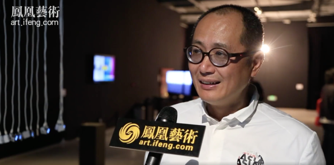 ▲ “2021亚洲数字艺术展”开幕现场,策展人邱志杰在展览现场接受“凤凰艺术”采访