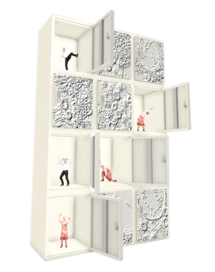 邵志飞(Jeffrey Shaw )的《SAFE HOUSE》,以储物柜形式呈现,通过平版电脑打开柜门,每个储物柜皆展示一个男性或女性的人像,正在重复各种体力消耗动作。作品道出了疫情下社交隔离的现实情况,在禁足威胁的范围内,人们过着超越形而上思考的荒诞生活。