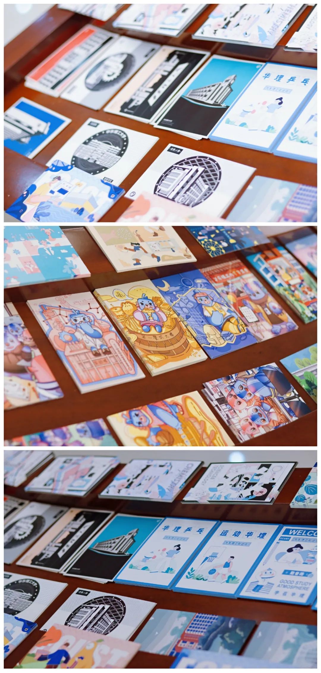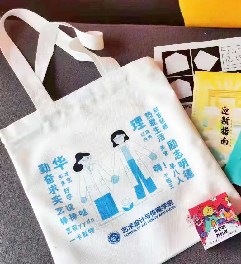 迎新帆布袋图案设计源于艺手绘青春工作室 陈心怡同学为华理设计的一套IP形象,华理给人第一印象是理性严谨,所以以蓝色为主色调,再通过矢量插画的方式来展现华理学子好学上进、活泼、多才多艺的形象。希望小萌新们背上新包,开启崭新的大学生活!