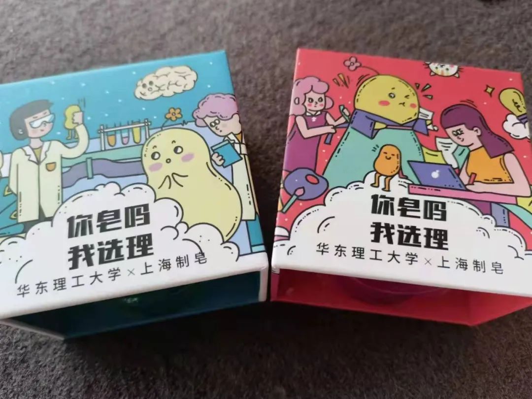 “你皂吗,我选理”这个名字来源于电视剧《爱情是从告白开始的》女主池早早在欧皓辰窗下冒雨大喊“你造吗!我宣你!”这句告白语,包装全部视觉设计由老字号擦亮实验室成员姚雨晴同学操刀绘制,分为红蓝两款,用活泼诙谐的画风分别绘制我校文商类学科和理工类学科的学习生活场景,画面中少不了华理super star小花梨,还有和小花梨长得很像相见恨晚的来自上海制皂的小肥皂(可以在画面中找到它吗)。每份包含两块手工皂,分别是“荷你一起”薄荷精油皂和“玫你不行”玫瑰精油皂。