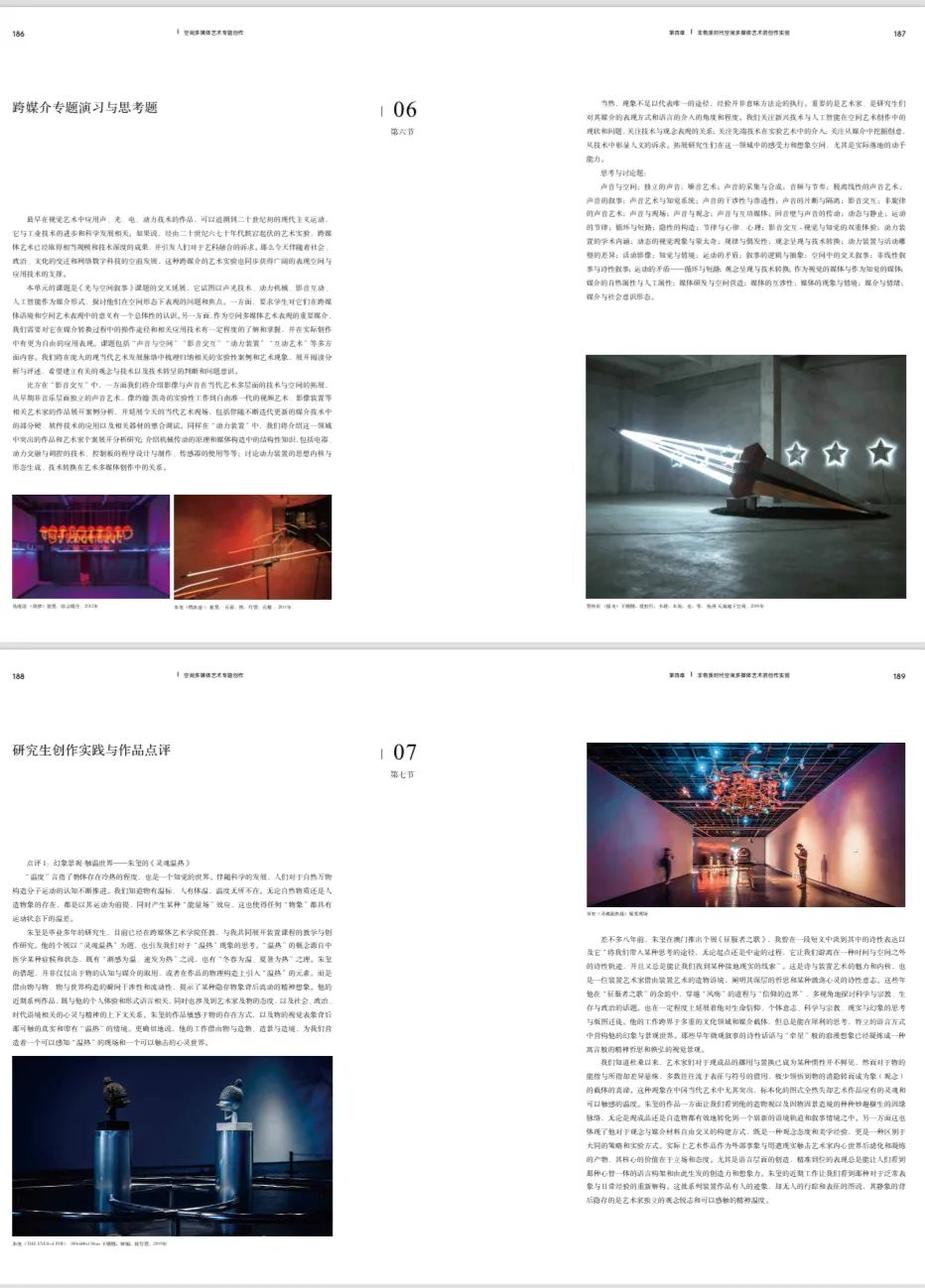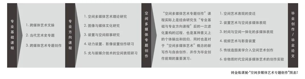 实际上,早在2005年,笔者于国内率先提出“空间多媒体艺术”概念,并向学院提出以“空间多媒体艺术”定位原综合艺术系综合造型工作室。次年完成调整后的“空间多媒体艺术”工作室的教学计划与课程设置,并形成“空间多媒体艺术”研究方向最初的硕士生培养方案,开始招收该方向的硕士研究生。同时,在前期序列课程的基础.上,借由“空间多媒体专题演习”,强调个体界面与独立创作方式的输出,以此作为研究生毕业创作前的重要创作内容。