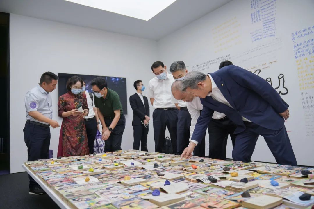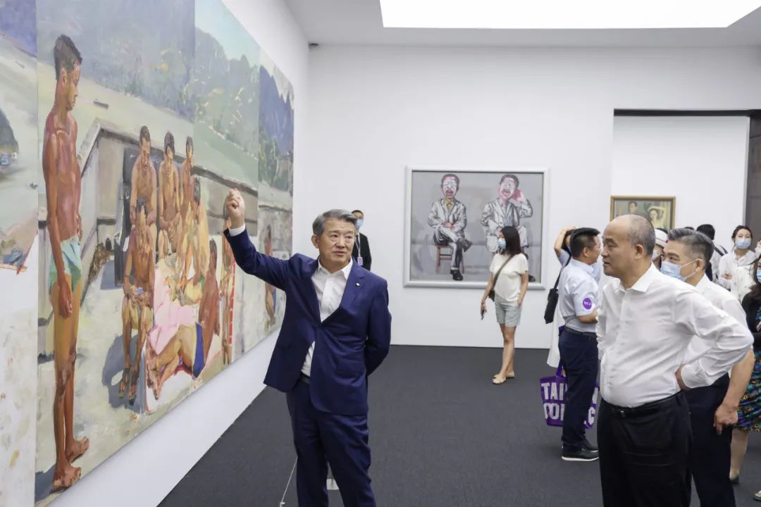 泰康保险集团创始人、董事长兼首席执行官陈东升向来访嘉宾介绍著名艺术家刘小东作品