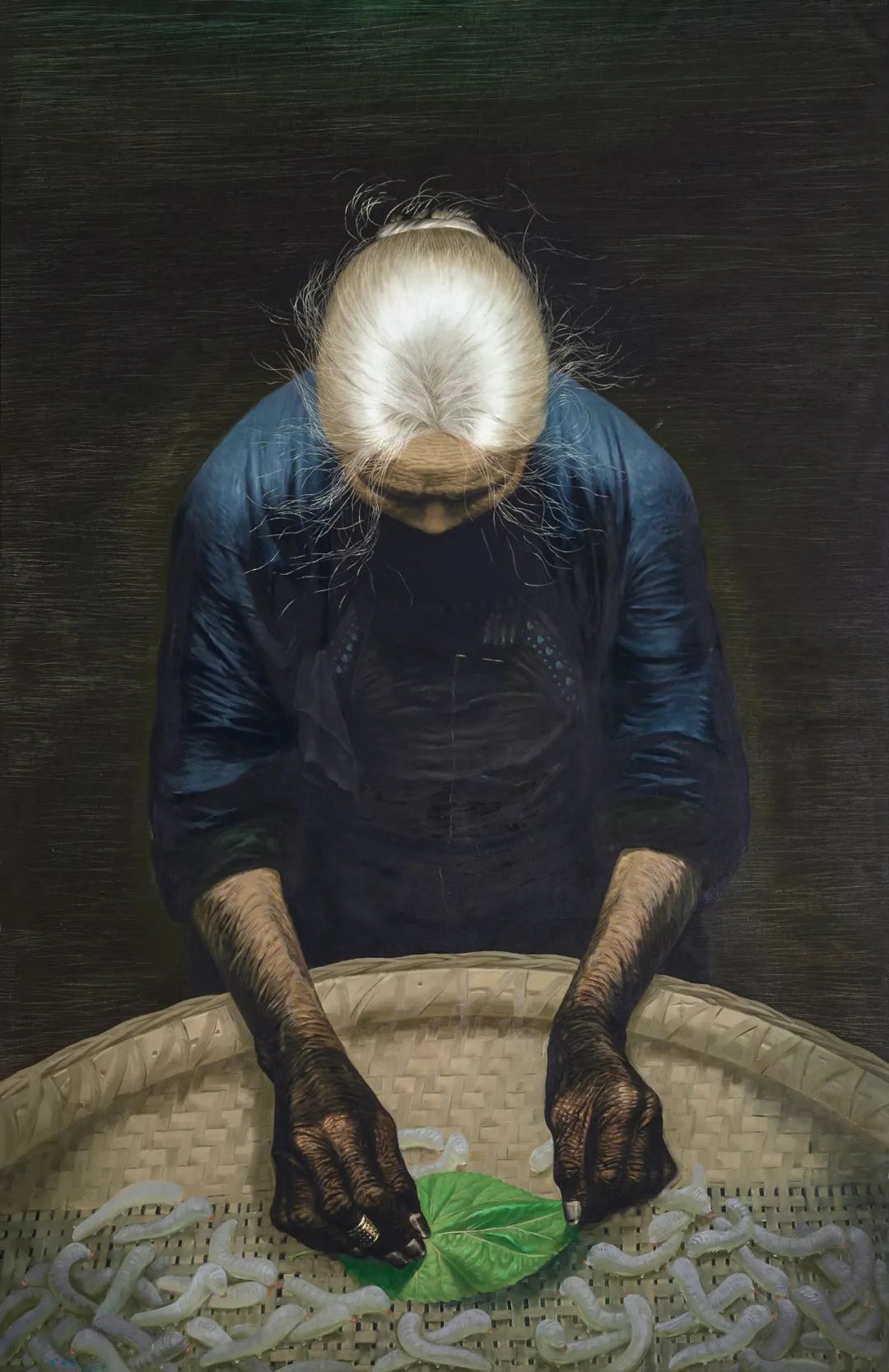 《父亲》是新中国美术史上一件具有划时代意义的作品,当时在全社会引发了巨大的轰动。罗中立在大巴山为创作《父亲》收集素材时,就有了创作《春蚕》的想法。《春蚕》延续了罗中立照相写实主义的风格和去政治化的、人道主义的关怀。但与《父亲》对人物面部细节的精雕细琢不同,《春蚕》将人物的面部完全隐去,只能看到一位年迈的母亲,低着头拨弄着手中的桑叶。在深色的背景下,光从上到下打在人物的头顶,母亲蚕丝般的银发丝丝分明。罗中立曾谈到,之所以想要画一位养蚕的母亲,是基于中国传统农耕社会中男耕女织的性别分工,母亲和父亲一样,都是以普通的、匿名的劳动者的身份出现在画面中。罗中立的作品,代表了80年代初绘画的新转折,代表了我们对“人”有了新的理解和再现方式。