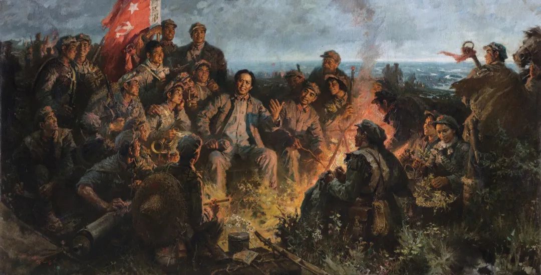 《革命理想高于天》这一标题取自萧华创作的《长征组歌》中的一句歌词,“官兵一致同甘苦,革命理想高于天”。它描绘的是红军从南向北穿越松潘草地途中的一个夜晚。松潘草地沼泽密布,一望无际,给红军造成了惨重的非战斗减员。画面捕捉到的是一天疲惫的行军之后,战士们围坐在篝火旁,听毛主席讲故事的场景。在陈东升看来,《革命理想高于天》反映了“文革”后期文艺的新变化,年轻艺术家开始摆脱题材和风格上的呆板、教条,将革命的浪漫主义色彩融入到绘画当中,而这一变化背后,是整个中国社会走向开放的新气象。