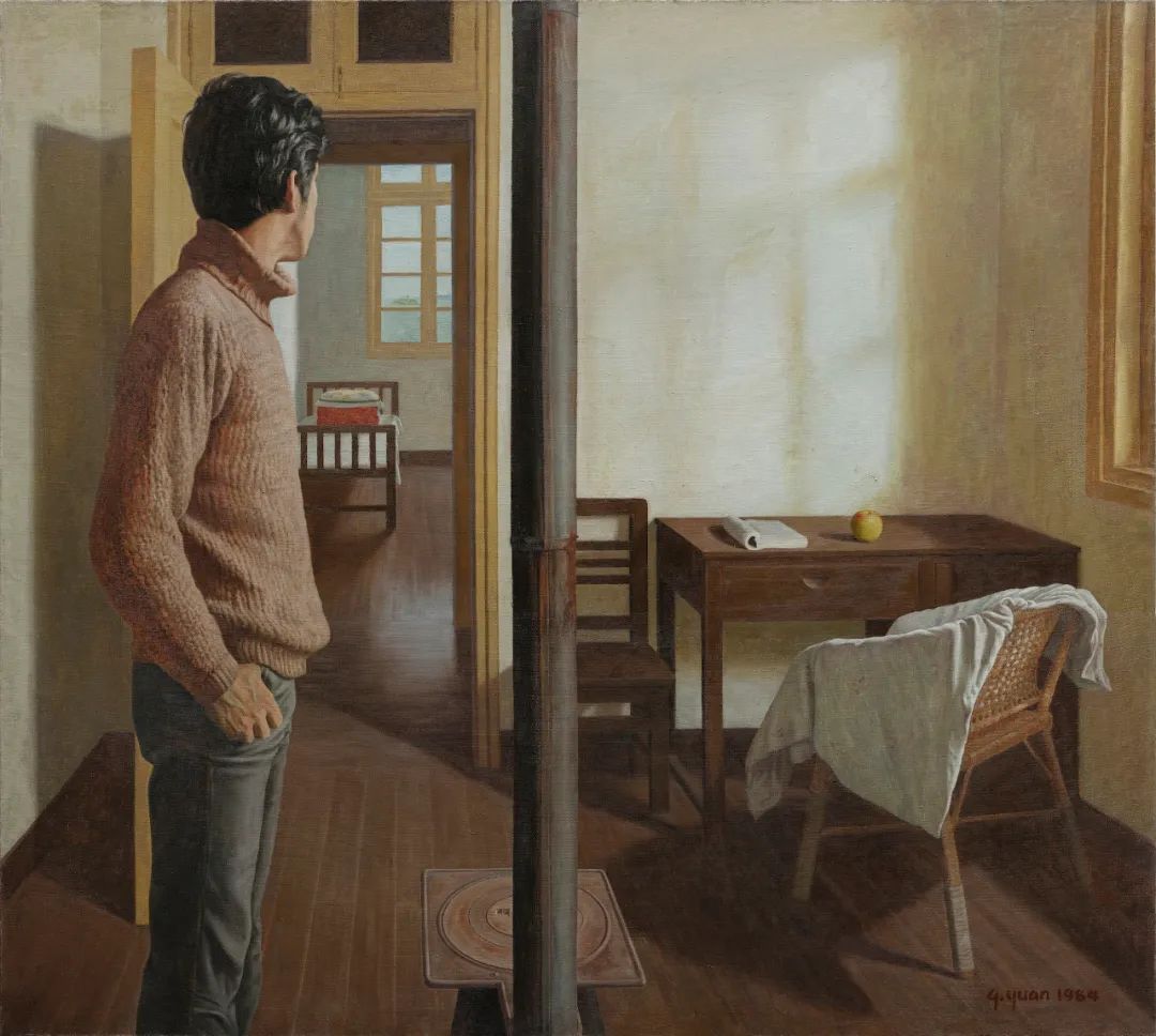 画面上的主体人物没有正面朝向观众,通过画中主人公的视线把观众的视线引进了画面深处,一个更大的、无限的空间,吸引观众不断地通过阅读画面细节去发散思考。袁庆一回忆这件作品的创作时说:“我那会儿非常喜欢读哲学类的书,例如萨特的‘存在主义’,它强调个体性的存在、关注强烈的个人表现,这两点对我影响很大。”