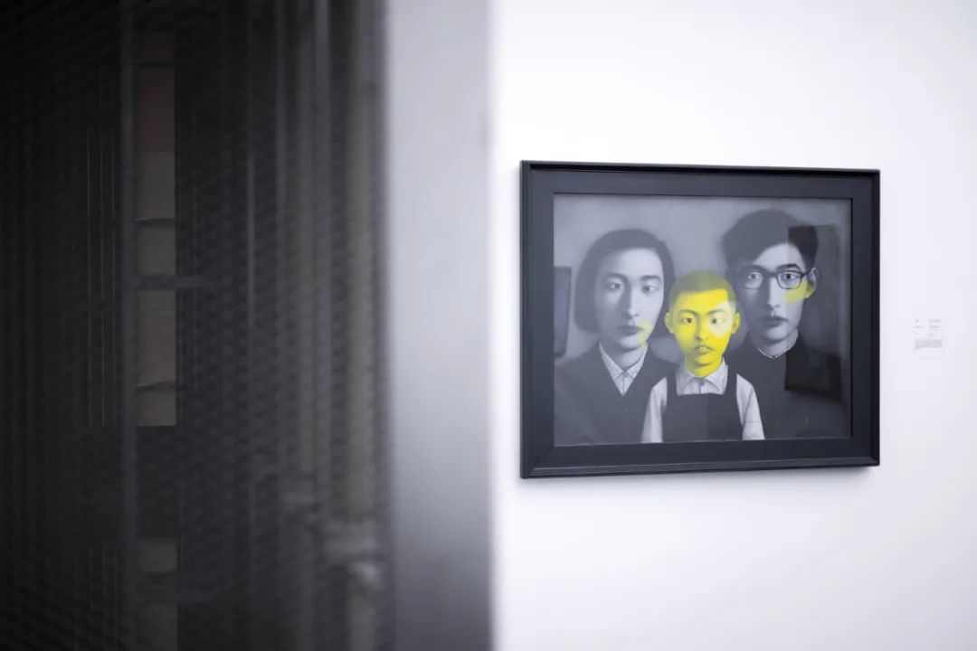 张晓刚以“文革”时期家庭照片为蓝本创作的“血缘——大家庭”系列绘画已经成为了中国当代艺术的代表性作品之一。画面中灰色调的经典三人家庭肖像,呈现出“文革”时期照相馆固有的拍摄模式和整齐划一的家庭面貌。画中人物身着标准化的服装,表情犹如标本般木讷、呆滞,他们脸上出现的黄色光斑则指涉着过往的时光,也是那个时代中的创伤记忆呈现于肉体之上的疤痕变异。