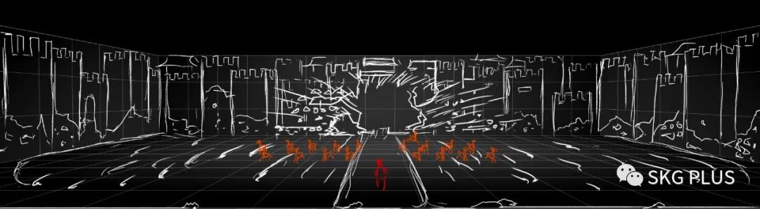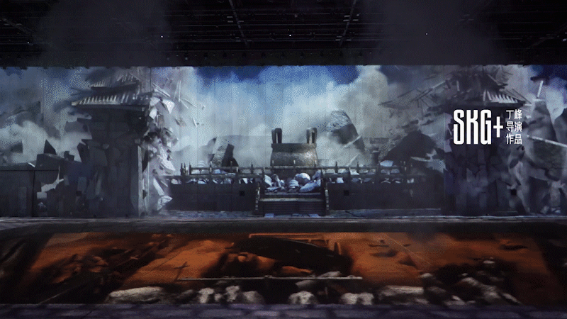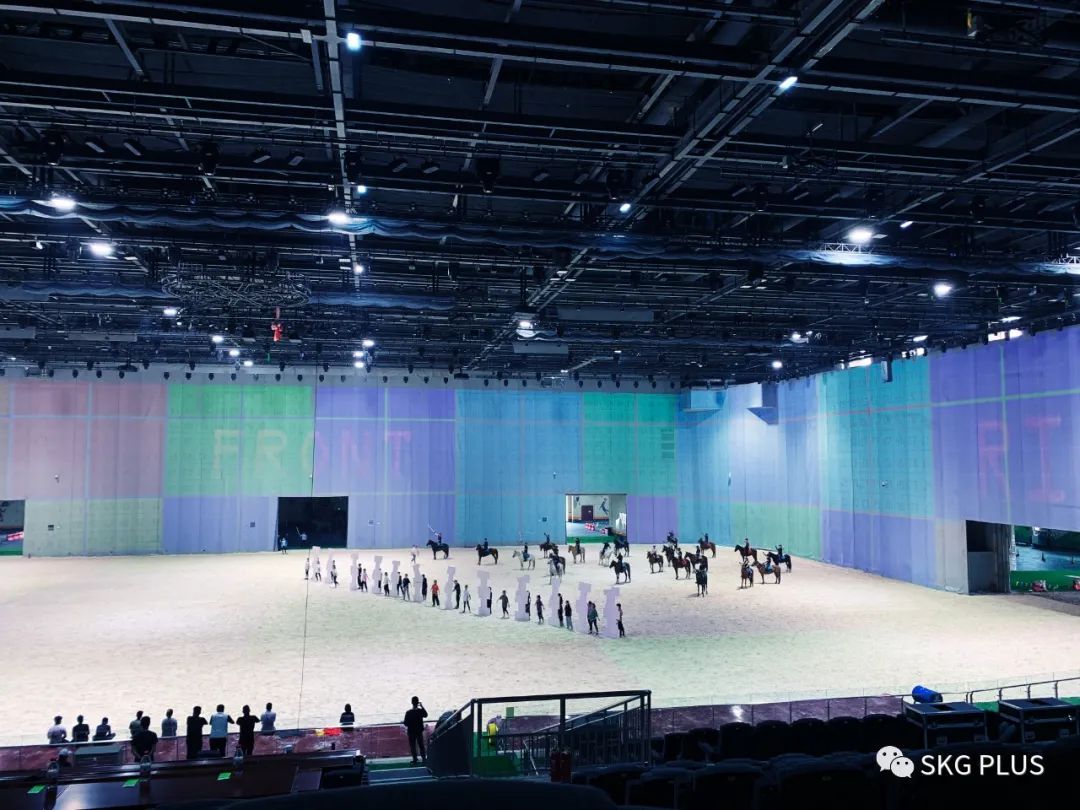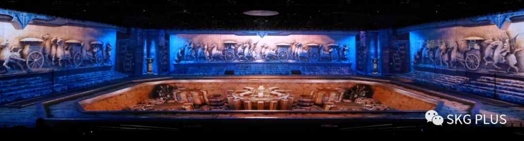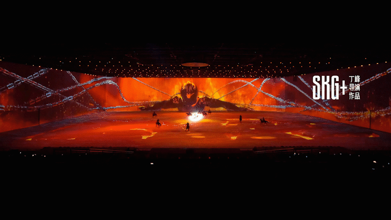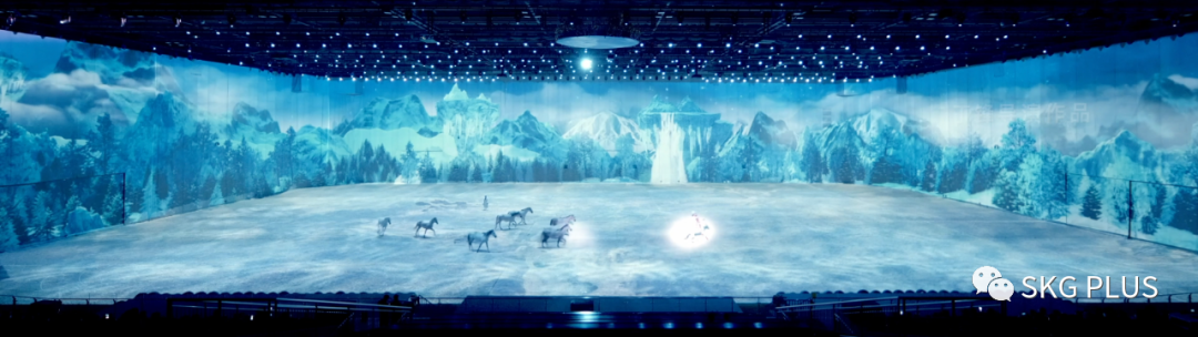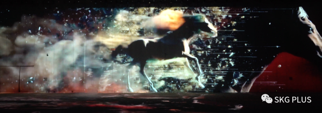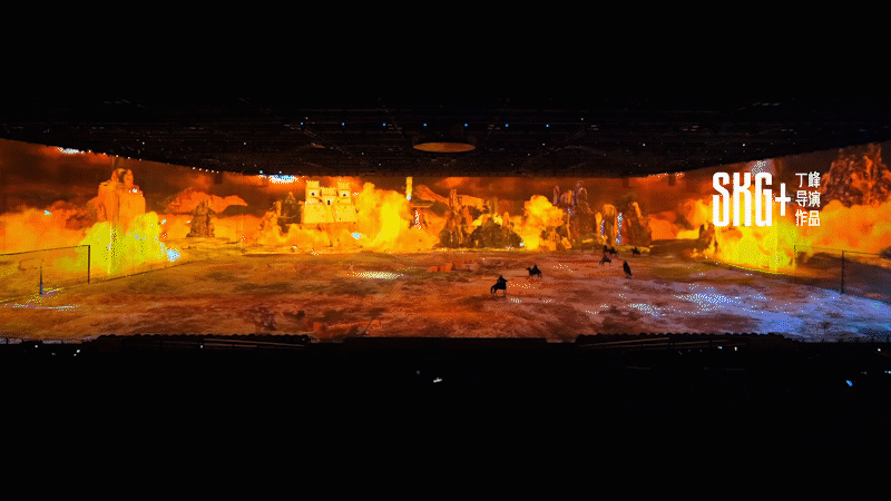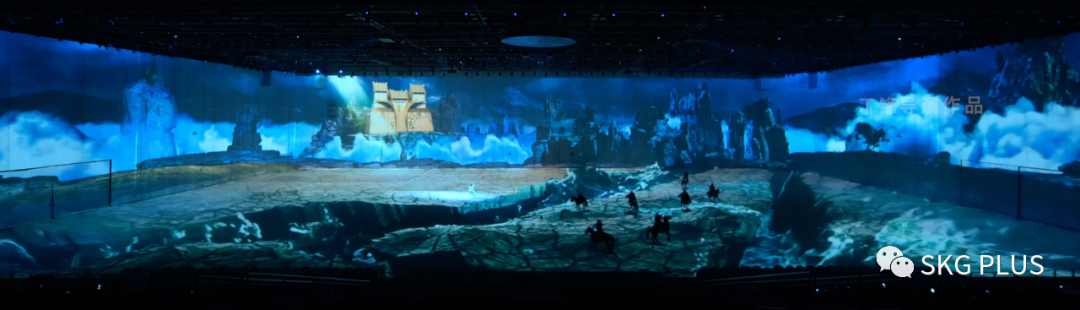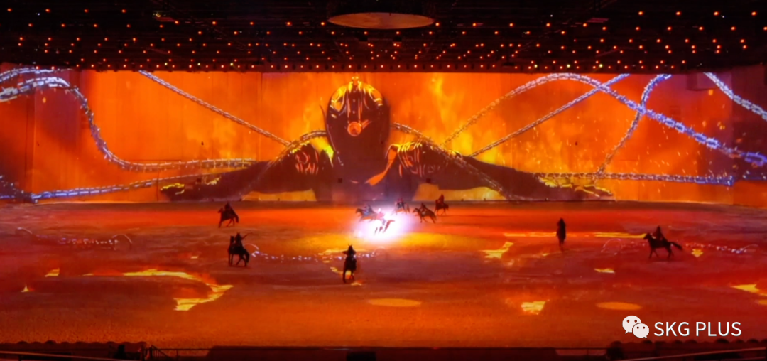 这部由丁峰导演执导、泛亚文旅策划的大秀在一座面积 7000 平方米、空高 20 米的全景体验剧场举行,这部舞台剧分为《以尘入马》《雪飔滹沱》《秋牧赛歌》《鏖战殇祭》《飞马巡城》五幕,我们 SKG+ 则负责其中的大部分视觉内容创作。