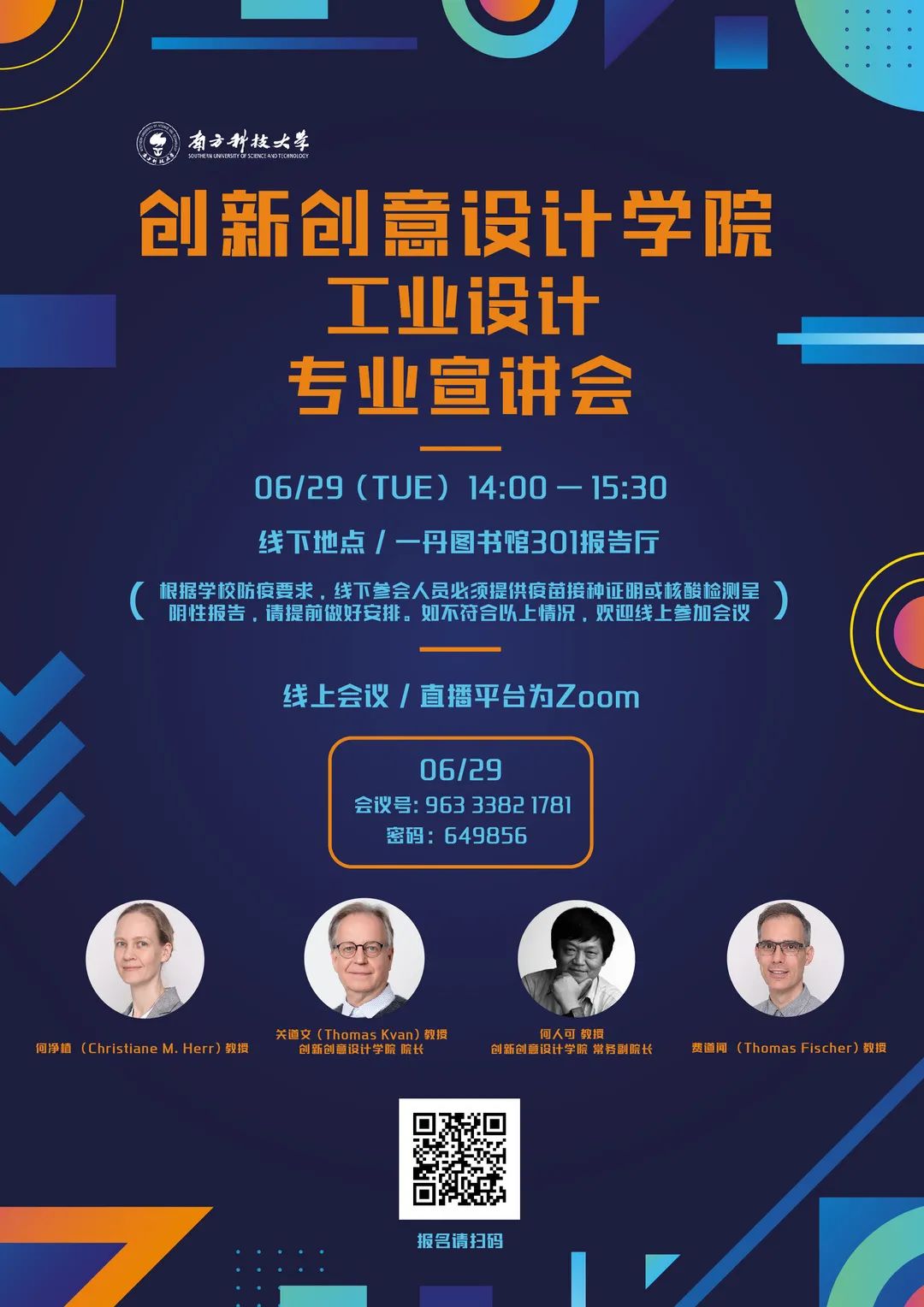 快报名参加创新创意设计学院工业设计专业宣讲会,最后一场将于6月29日(周二)下午14:00 — 15:30举办,院长关道文教授(Tom Kvan)、常务副院长何人可教授、何净植教授(Christiane M. Herr)、费道闻教授(Tom Fischer)将从设计是什么展开,为大家详细介绍设计学院、学院独特的学科设置和课程特色、设计产业、就业升学前景以及设计教学与科研等信息,不要错过与大咖教授们互动交流的宝贵机会!此次宣讲会将以线上线下形式同时举办,欢迎各位对设计感兴趣的同学和学生家长踊跃报名!