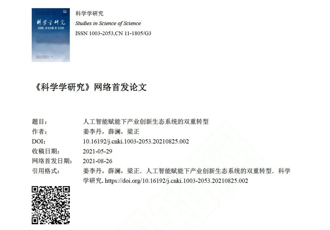 姜李丹,薛澜,梁正.人工智能赋能下产业创新生态系统的双重转型.科学学研究. https://doi.org/10.16192/j.cnki.1003-2053.20210825.002