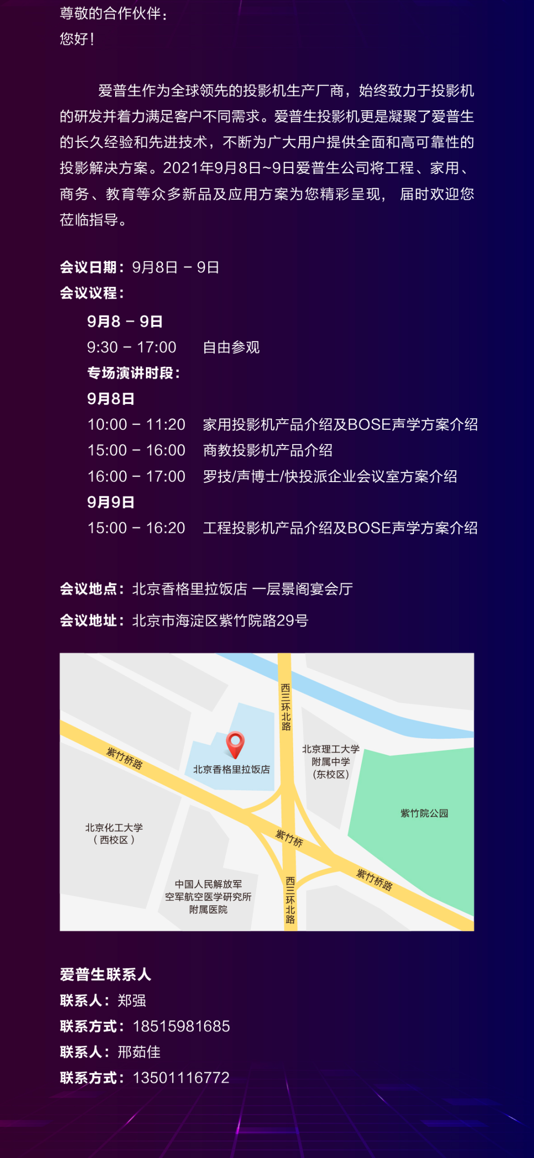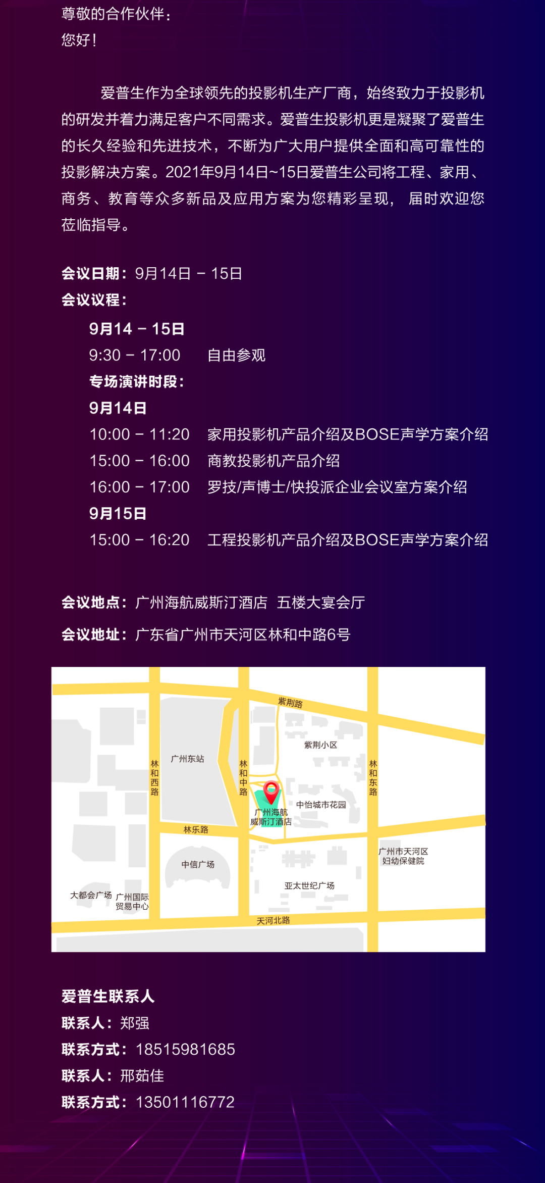 与科技交流,同光影互动 感受一场来自爱普生的绚丽视觉呈现 作为全球领先的投影机生产厂商 爱普生投影机凝聚了 长久经验和先进技术 不断为用户提供全面可靠的投影解决方案 本次爱普生全产品线投影机新品巡展 9月开始,11月结束 全程共有六站 分别为 北京、广州 成都、武汉、西安、上海 北京 9月8日-9日 北京香格里拉饭店 一层景阁宴会厅 (北京市海淀区紫竹院路29号) 点击获取邀请函 广州 9月14日-15日 广州海航威斯汀酒店 五楼大宴会厅 (广东省广州市天河区林和中路6号) 点击获取邀请函 突破视界,精彩抢先 爱普生投影机满足 工程、家用、商务、教育等多场景应用需求 无论是适合家庭娱乐的EH-LS300系列、EF-12等 还是助力办公、教育的CB-L730U系列、 CB-735Fi等商教投影机 更有多个精彩工程投影方案 在这场巡展中,均惊喜现身 现场多个商教、工程方案,让我们来提前一探究竟! 球衣互动Mapping 方案介绍: 数字投影技术结合精心设计制作的视觉特效,让静态的商品动起来。搭配互动设备,实现人与物的交互,为消费体验升级设计,有效提升宣传效果,为商品展陈提供无限可能。 方案组成: 一台激光投影灯EV-110 2,200流明*1*2 WXGA (1280×800) 分辨率 1台激光雷达*3 CAVE沉浸式投影解决方案 方案介绍: CAVE投影系统是由4个面硬质投影墙(含地面)组成的高度沉浸的虚拟演示环境,配合三维跟踪器,用户可以在被投影墙包围的系统近距离接触虚拟三维物体,或者随意漫游“真实”的虚拟环境。 方案组成: 4台爱普生CB-PU1008W WUXGA(1920×1200)分辨率6,000流明*1*2 3只ELPLX01 超短焦镜头 1只ELPLU03S 短焦镜头 双机自动叠加方案 方案介绍: 双机自动叠加方案(180寸),使用Epson Projector Professional Tool 软件与 ELPEC01 外置摄像头可让两台投影机投射的画面进行点对点的自动叠加,安装便捷的同时,可实现20,000lm低成本高亮度方案,带来更震撼的视觉效果。 方案组成: 2台爱普生CB-PU2010W 2只ELPLU04镜头 WUXGA(1920×1200)分辨率,10,000流明*1*2 2个爱普生外置摄像头ELPEC01 双曲球带自动融合解决方案 方案介绍: 融合了大画面影像、环绕音响、体感互动、3D沉浸以及定制片源的球幕(球带)投影方案。与BOSE有源扬声器共同呈现。 方案组成: 2台爱普生CB-L635SU WUXGA(1920×1200)分辨率 6,000流明*1*2 研讨+录播智慧教室 方案介绍: 集成专业的东博录播设备,及青鹿盒子多屏交互系统,不仅能保证远程教学师资共享,也能实现本地多屏实时联动,实现多课堂,多学生间的交互学习,用“互联网+教育”方案助力教智融合进一步升级。实现教师资源共享,教育公平! 方案组成: 显示:2台激光投影机 CB-735Fi + 白板*3 录播功能:1台东博远程录播设备*3(远程主机, 音频处理器, 麦克) 研讨功能:2台青鹿盒子方案*3(屏显主机) 激光高亮+罗技大型会议室方案(远程会议方案) 方案介绍: 适合各种规模和布局的大型会议室。为您的空间打造理想的扬声器和麦克风配置,并提供整洁的线缆管理和多种安装选项,让用户享受便捷的一触式参会和内容分享体验。 方案组成: 爱普生激光高亮投影机CB-L730U+罗技CC5000e Plus*3+罗技TP100*+会议主机*3 激光高亮+无线投屏方案(本地会议方案) 方案介绍: 爱普生全新无线投屏设备,搭配爱普生投影机产品,轻松高效地实现画面同步与共享,降低会议空间布置难度,提升会议体验与会议效率。 方案组成: 爱普生激光高亮投影机CB-L730U + 爱普生无线投屏设备(内置基站) 爱普生激光投影静享方案 方案介绍: 整合了EF-11投影机显示设备、会议空间、无线同屏设备以及视频会议设备,打造了一个全方位匹配用户日常会议需求的整合方案,提升空间利用率与会议沟通效率。 方案组成: 声博士定制静音舱*3 + 爱普生EF-11商务激光投影机 + 罗技BCC950*3 + 投屏设备*3 灵活会议空间方案 方案介绍: 快速布局,轻松整备,重塑办公空间,在公共空间也能快速搭建完成集合视频会议、无线投屏、书写沟通、文档展示等功能的会议空间,提升办公环境利用率。 方案组成: 爱普生EF-11商务激光投影机 + 声博士可移动静音板*3 + 快投派无线投屏棒*3 + 可书写幕布*3 包括工程、商教、家用在内的 现场十余精彩方案 尽在爱普生新品巡展 在这里,期待与你邂逅 向上滑动查看更多备注信息