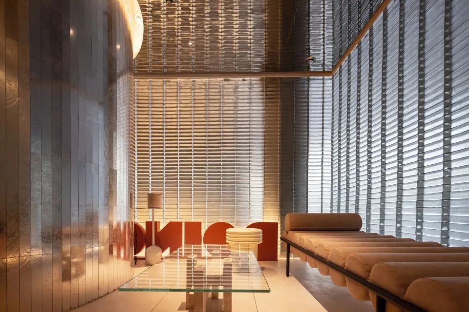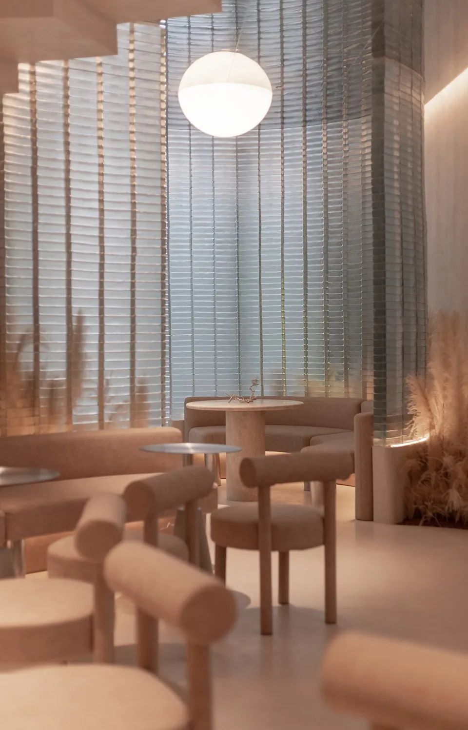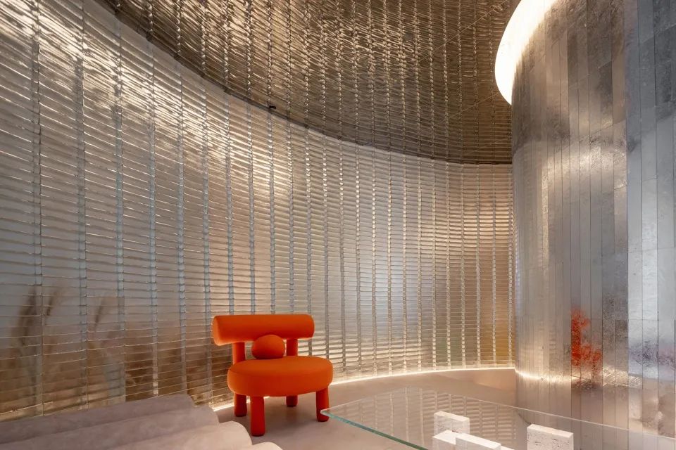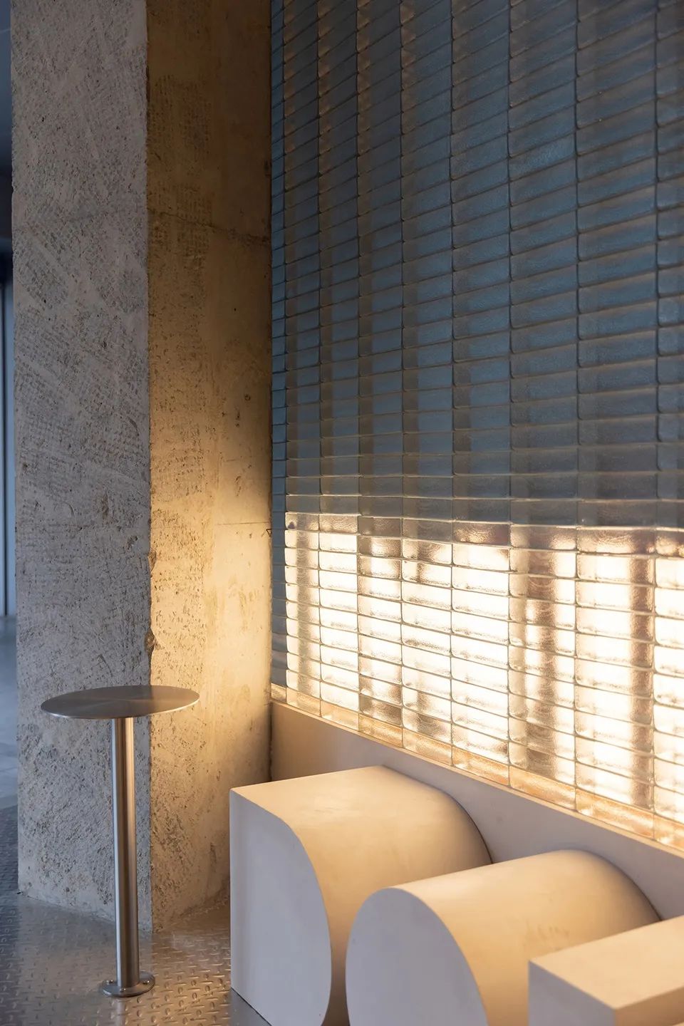 从地到顶的墙体限制了视线和行进,但弧形环绕包裹,每一隅都是独立的小天地;秩序垒叠的玻璃砖冷冽坚硬,但层层筛滤让光变得温柔,时间也慢了下来。