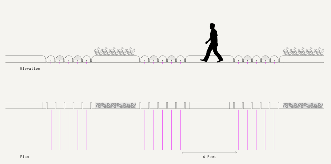 圆柱体不仅能够对广场的空间感知进行限定,同时通过内部光、扬声器、超声波传感器的集成设计,成为了人在广场中活动的感应器和发声器,适用于任何有人群经过、休憩的公共空间。