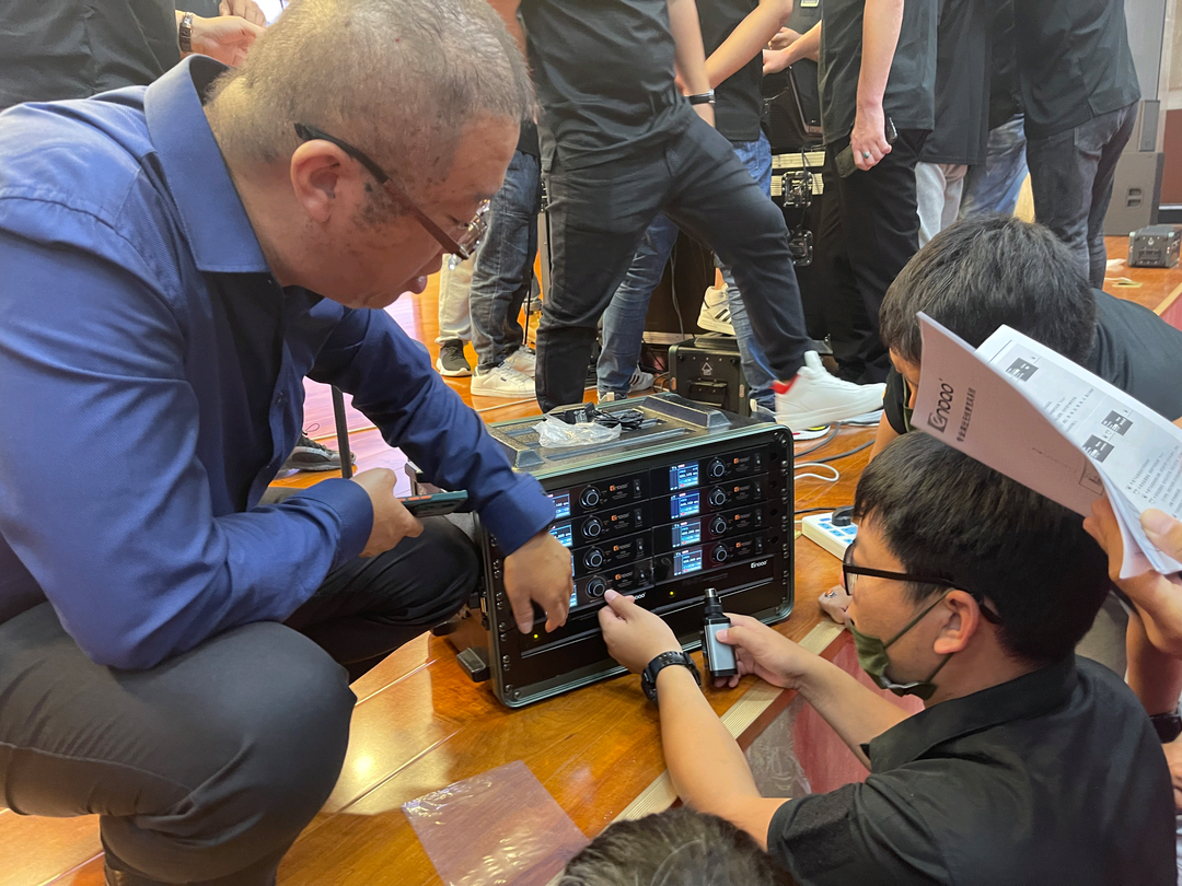 随后,设备捐赠厂家广东省恩平市恩宝电子有限公司的技术经理郭鹏,讲解了恩宝A3S无线话筒的特点和使用方法。