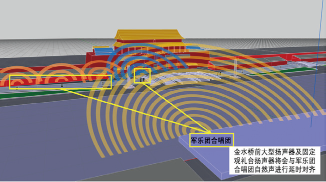 在有军乐团、合唱团凑唱表演时,使用线阵列扬声器对长安街北区做声音的覆盖。由于现场军乐团人数较多,铜管和打击乐器的自然声比较大,在城楼和固定观礼台上会听到两个声音,如图11所示,采用了做声音延时的方法,使奏唱表演时的听感统一,声音效果自然就舒服了。