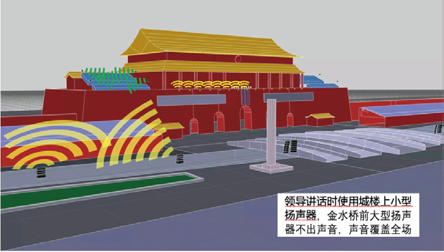 对于领导讲话的语言声音场景,如前所述,采用小型扬声器和线阵列扬声器覆盖城楼和固定观礼台。整体语言声音不做延时处理,城楼下面的线阵列扬声器不供声,如图9所示。这种声音场景的设计,是综合考虑城楼上面的区域和大会的流程,保证领导讲话时全场声音的清晰度和均匀度。