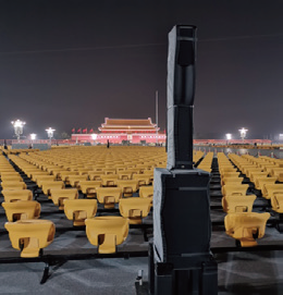 长安街南侧观礼台区域分为大会堂北、国博北、广场区域,大部分观礼台是平地搭建,仅广场区域中的部分观礼台抬高。因每个区域宽度和深度不一样,采用不同型号的扬声器进行覆盖。