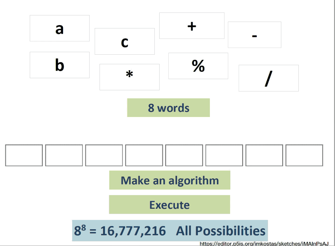 第三个例子以文字为主。康思达提供了八个英文单词进行排列,产生了16777216种可能性。他非常确定,在这所有的结果里,肯定有一句话是所有组合里最好的、最深刻、最完美的一句话。如何在这样庞大的数据里找到它呢?他提出了创造一个神经网络,在其中进行训练和大量的搜寻,他最终找到了他认为非常有意义的句子。