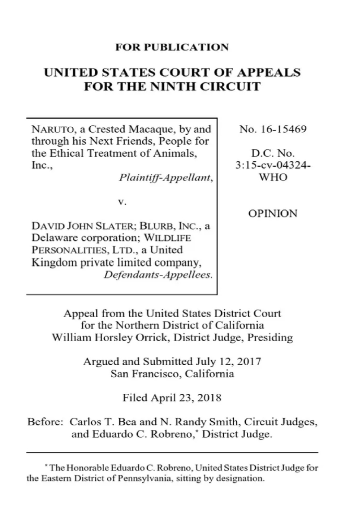 2014年旧金山的一场诉讼,一方是一个摄影师,而另一方是一只名为“Naruto”的猴子。一只猴子把摄影师告上了法庭。
