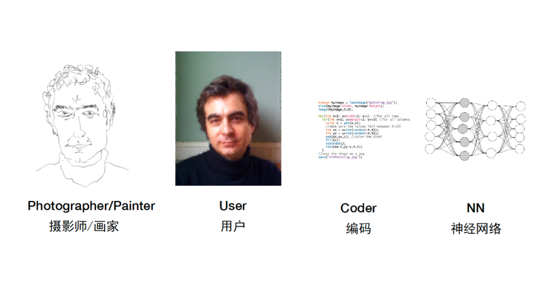 我们在图片上可以看到编码,而编码是什么呢?编码就是一些文字,甚至是一些指令,让计算机去执行。当所有的指令整合在一起,换一下顺序,算法也会改变。如果再打乱它们,又会产生一些新的算法。把程序上的这种过程放在一起,就会成为一个神经网络。这个系统会生成新的系统,而非人。我们认为这些根据原作生成的东西跟原作是有关系的,但它其实是由神经网络生成的。