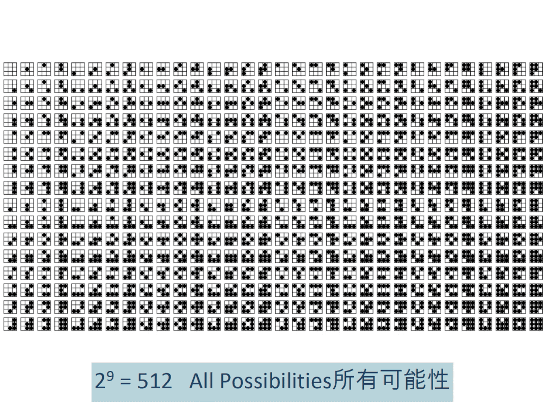 如何找到其中最好看的组合,我们需要一个标准,也就是所谓的设计。如果以对称为标准,我们就会看到32个中心对称的组合,64个水平对称的组合和64个垂直对称的组合。在如此多的结果中,这些遵从一定规则和标准的组合就隐藏在其中,这就是我们在寻找的东西。