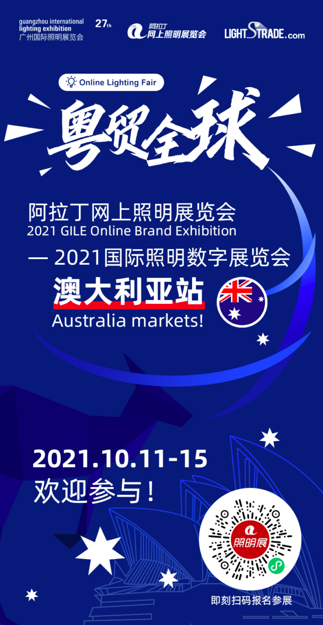 获广东省商务厅“粤贸全球”广东线上展览平台政策支持,阿拉丁国际站Lightstrade后续将持续主办系列线上品牌外贸展览会,打造线上境外照明展览会平台。2021年10月11日-15日,2021国际照明数字展览会· 澳大利亚站线上展诚邀各大外贸照明品牌企业参与。