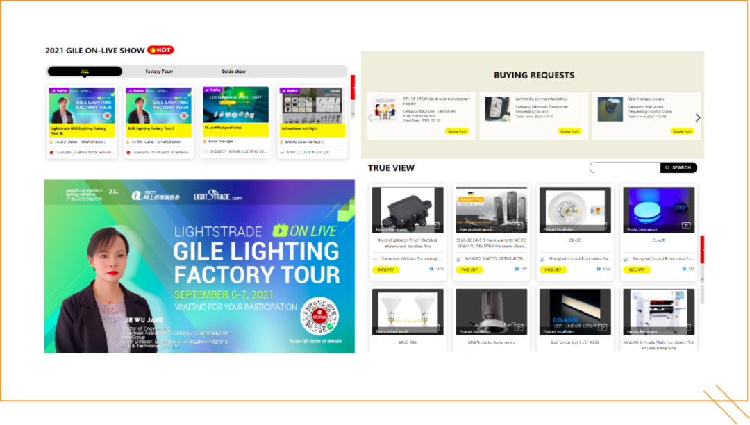 为期五天的2021国际照明数字展览会.巴西站线上展中,平台通过云上展示、短视频TRUE VIEW、智能商机询盘匹配、线上连线直播企业洽谈等核心功能,全方位立体在线展示照明企业产能实力;海外买家则可以通过新增的各类在线洽谈工具,如嵌入式WhatsApp即时沟通、一键询盘等,让商机对接更便捷。