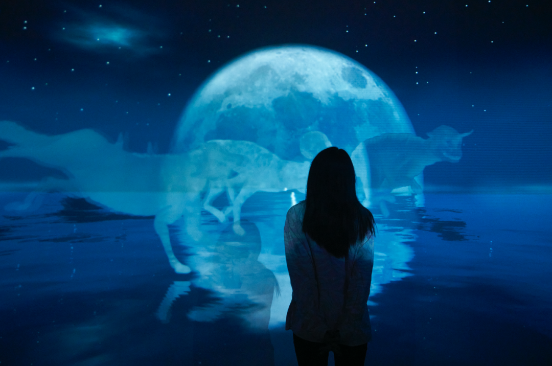 漫步于此,满屏的月球置于深蓝色的苍穹中,拍打中央的打鼓就可以助长“风势”。神兽甪端(lù duān) 、乘黄(chéng huáng)、驺虞(zōu yú)。在此与风共行,飘忽无踪,这些日行千里的神兽。究竟存在于远古山海还是源自浪漫想象?