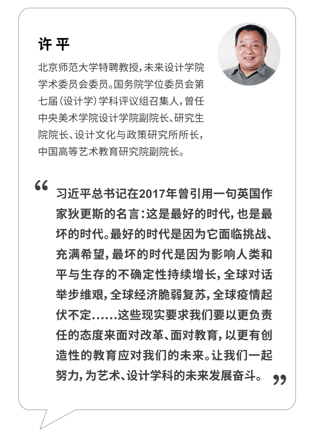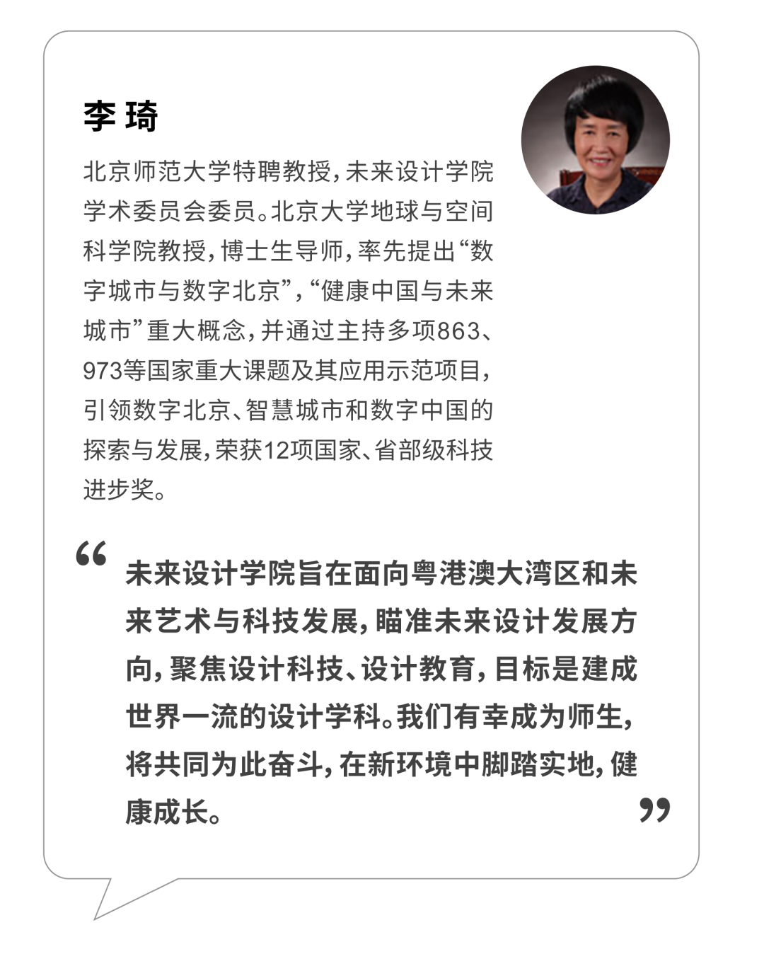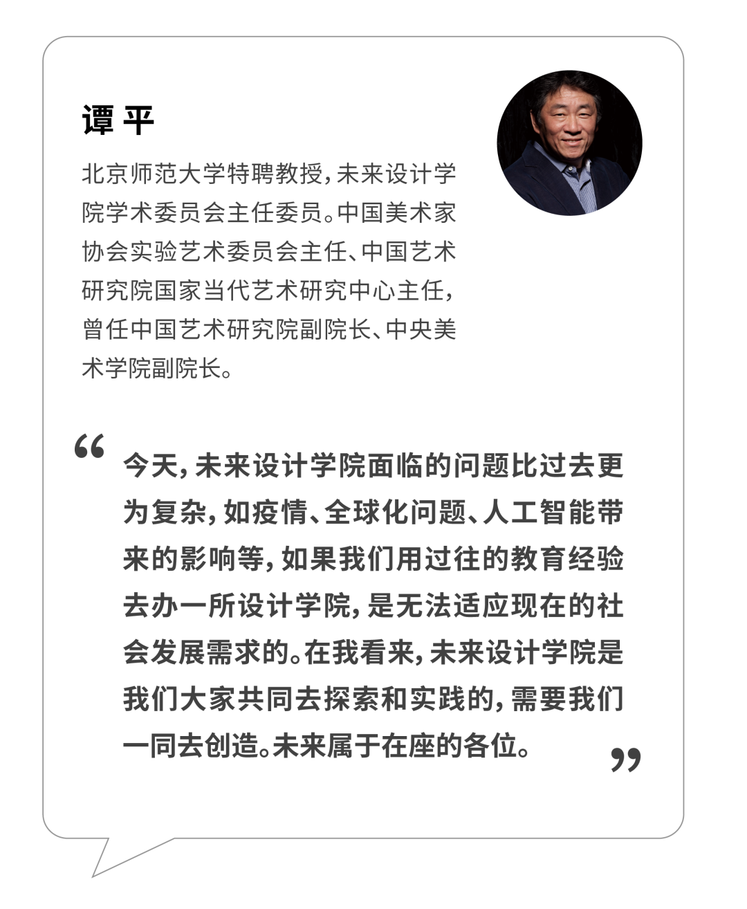 艺术与科学从本质上都是探寻真理和秩序,洞察宇宙和人心的奥秘,而设计就是当下将艺术与科学结合的重要手段。我们即将面对一个新科技文明的后疫情时代,设计在未来会有新的阐述和理解,很多艺术、设计专业会重新分类和定义。为此,未来设计学院聚集了一群卓越的学者和行业专家,他们代表着这个学科的水平,引领着未来设计与艺术教育的方向。我们非常有幸与这些师者同行。我们希望在这里培养具有设计创新思维,勇于面向未来,影响未来的领袖型设计人才。”