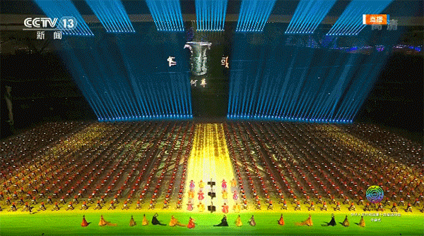 《黄帝颂》天籁之音回荡在开幕式会场,全场黄色竹简显现,大气磅礴。古老的文字在竹简上活灵活现,从地面连接到线幕,形成地面与空中的呼应,带来整体的视觉联动。