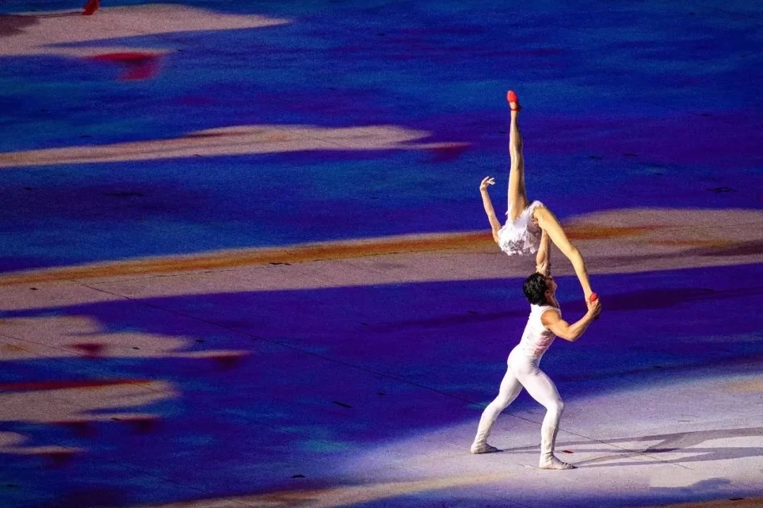 在盛世繁华的大唐,宫廷乐舞誉满长安城。演员舞姿轻灵,身轻似燕的在铺有华美地毯的地面上表演,随着一声冲天呐喊回荡在现场,一个特效转场,大明宫建筑群排山倒海之势而来,镌刻在西安的,气势恢宏的大唐宫殿被激活了,重新出现在开幕式文体展演现场。