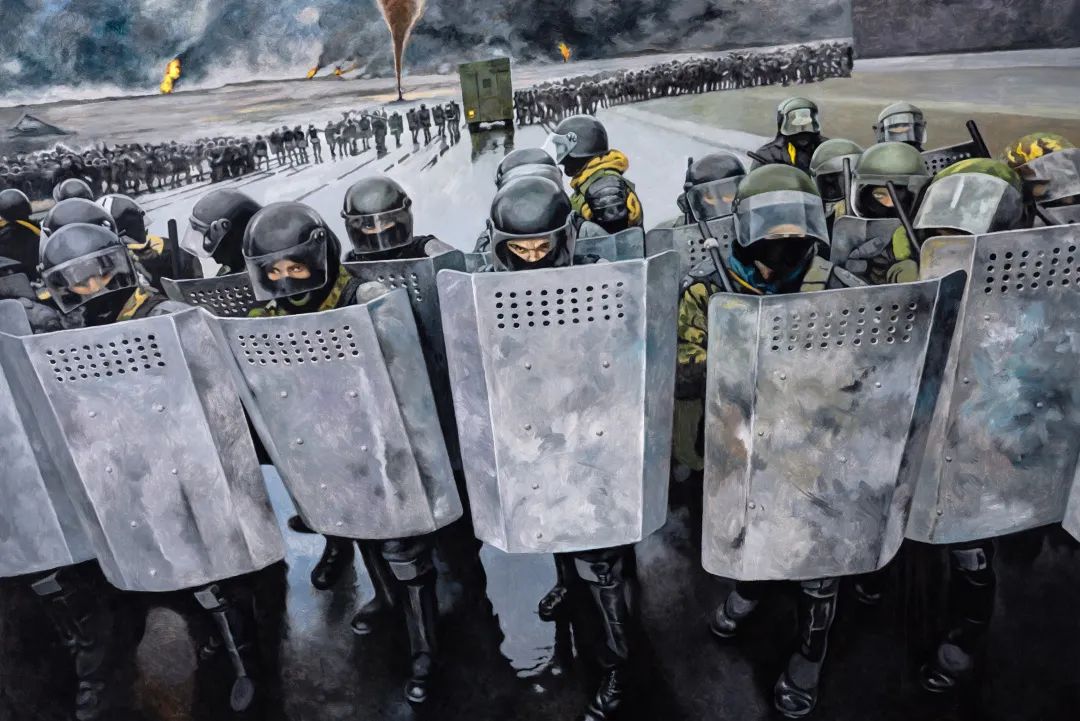 另一方面,人们很难不关注到石海涛在创作中对政治题材、冲突与矛盾场景的青睐,并能由此对画面作出诸多解读。但如果回到石海涛的关注视野与创作思路中则不难发现,表现不同的冲突与对抗并不是目的,它们是艺术家进入历史的一个切面。矛盾与冲突是人类历史上永远规避不了的特质,但人们试图去解决种种困境的方式与思路在不断推动着人类社会向前运动,于是在具体的历史事件中我们看到了一次又一次的战乱骚动、革命浪潮与思想解放,尽管发生于不同时空不同民族,但它们却呈现出高度的共性。石海涛尝试的是漂浮在历史的上空审视世界,并试图在这个视角下找寻自己能够被安置的位置。
