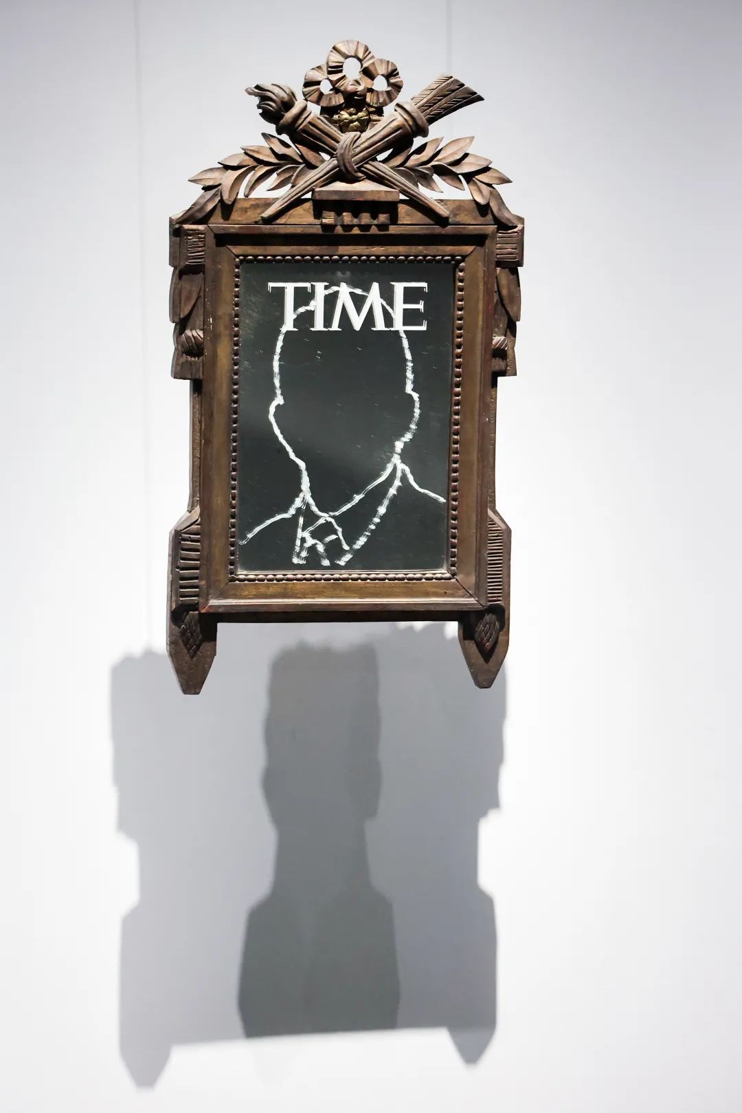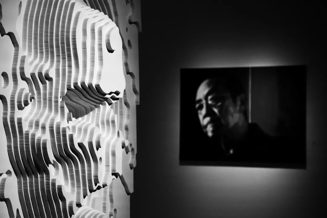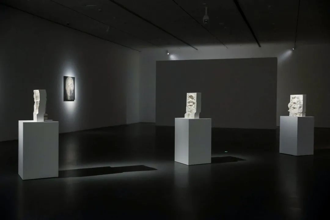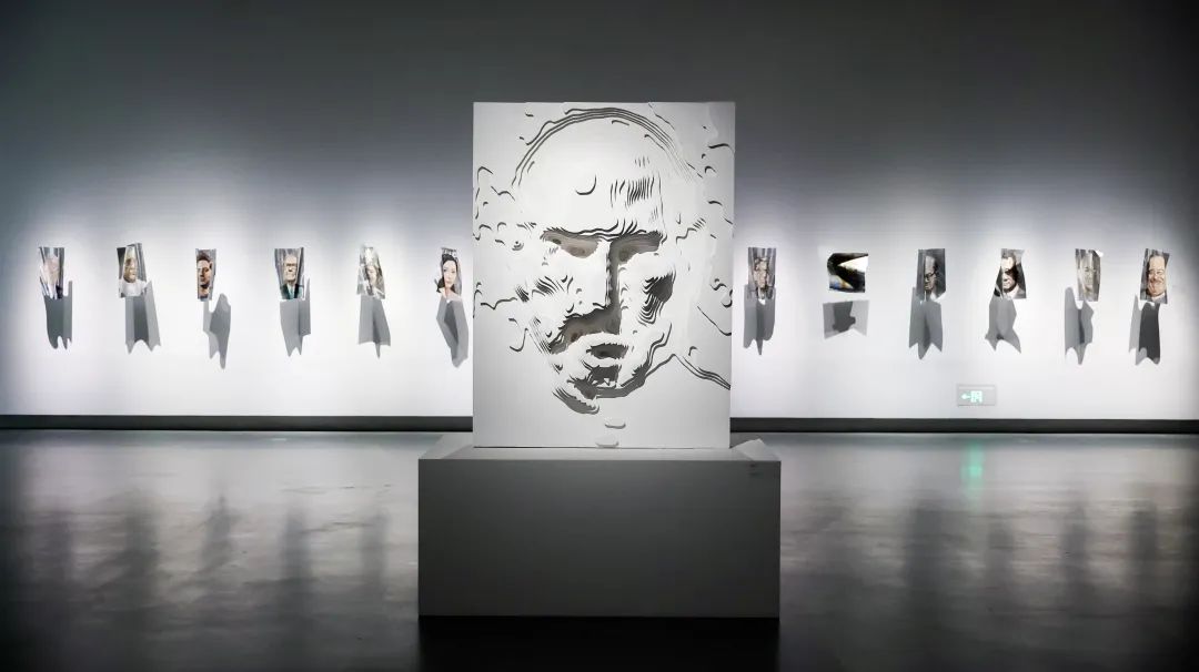 在第二个展厅中,《回声》中对王朝更迭与历史必然的讨论以近代中国的命运与脉络为切入点,在宏观的历史维度中,所谓的历史与当下似乎失去了明晰的分野。从入口处的孔洞中可以窥见石海涛为影响人类历史发展方向的系列人物竖起的一座座“丰碑”,越过思想的高峰、科技的革命,观众最终会被指引到一面镜子前,从镜前回望人类历史中曾经熠熠生辉的思想与革命,它们在当下无一不面临着新的困境。此时此刻,一个人、一个群体、一个民族处在如此浩瀚汹涌且不容回头的历史长河中的什么位置上?又能为前方的道路做些什么?展览至此引出了这样的设问与思考。
