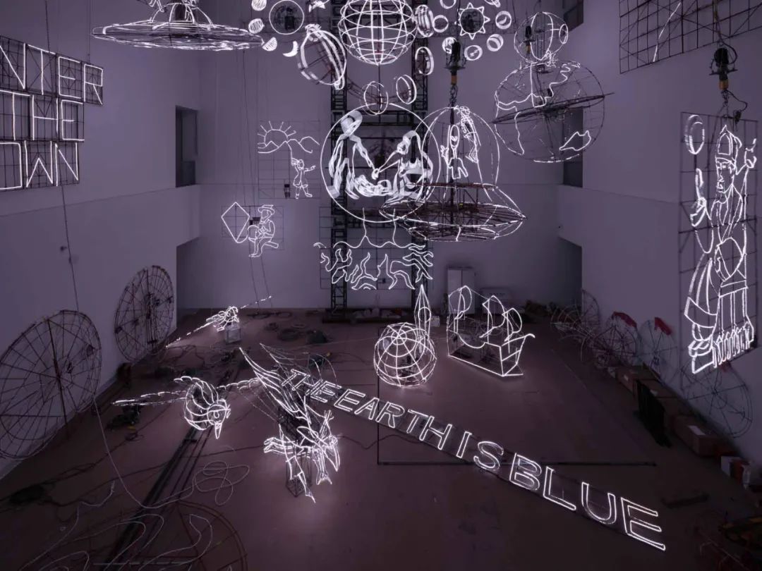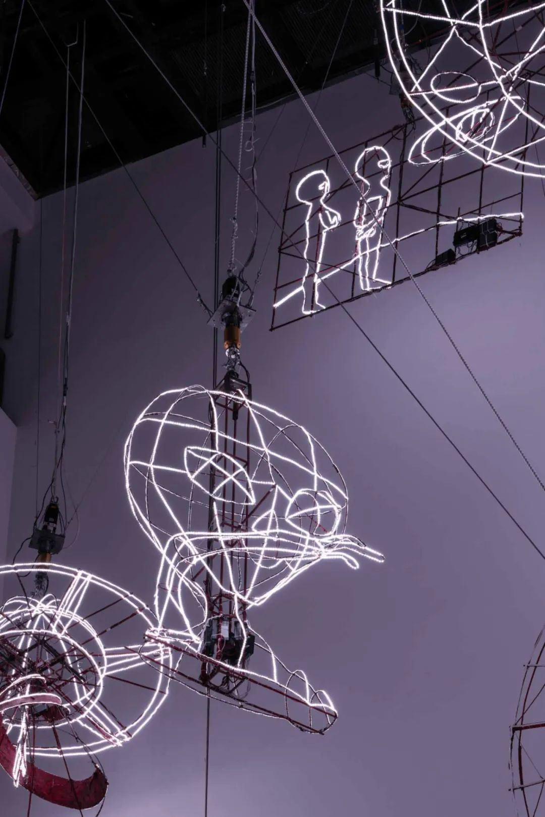 装置的形式来源于墨西哥烟花塔,各种木架、绳索交错,数十座马达控制的旋转装置不停歇地工作。此次展览的布展难度很大,疲惫的时候,蔡国强曾在空间的升降台上躺了下来,就好像“自己一路乘着故乡的风筝,驾游人类童年的宇宙船,浪漫天涯。”