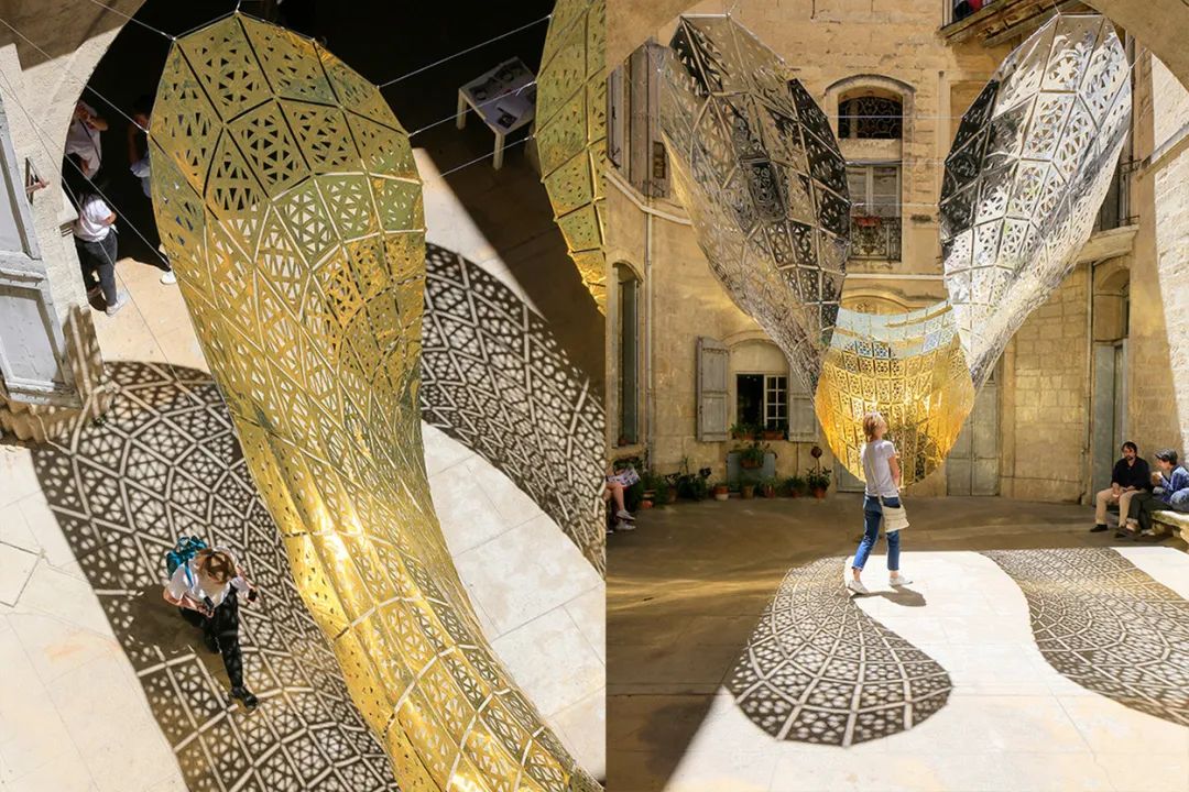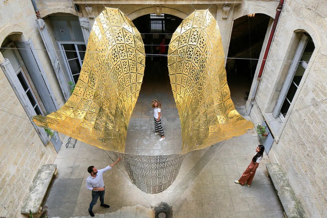 在2019年的建筑节活动中,一个跨学科的团队通过一个巨大的参数化装置诠释了“美”的主题。藏在院子里的这件艺术品从蝴蝶飞翔的悬浮运动中汲取灵感,抽象出昆虫的形态,象征着一种自由和短暂的感觉。由cristina nan、dirce medina patatuchi和carlos bausa martinez设计的“Le Papillon d'or”由金色二向色全息镜面乙烯基制成,可折射光线并根据有利位置提供各种装置体验。