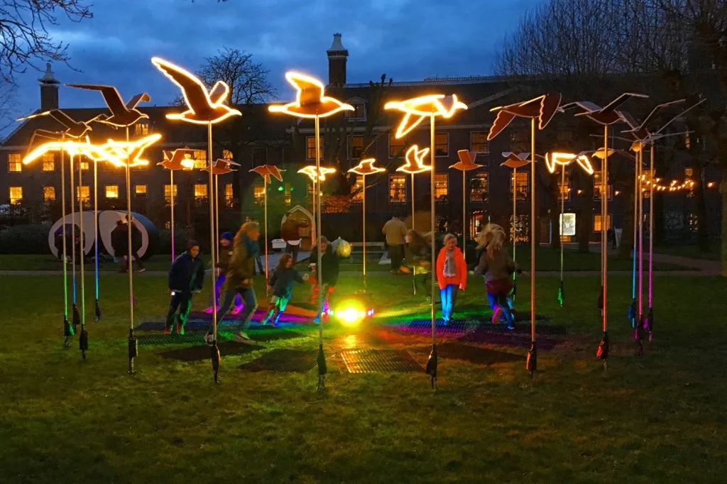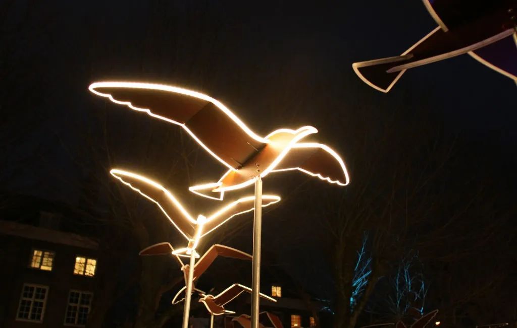 这件艺术品是每个人的游乐场。所有人都可以玩这个动画光雕塑。24只发光的鸟被排列成一个圆周约8米的圆圈。鸟儿似乎在扇动翅膀。